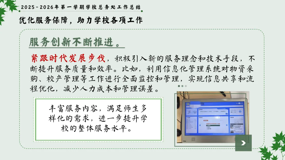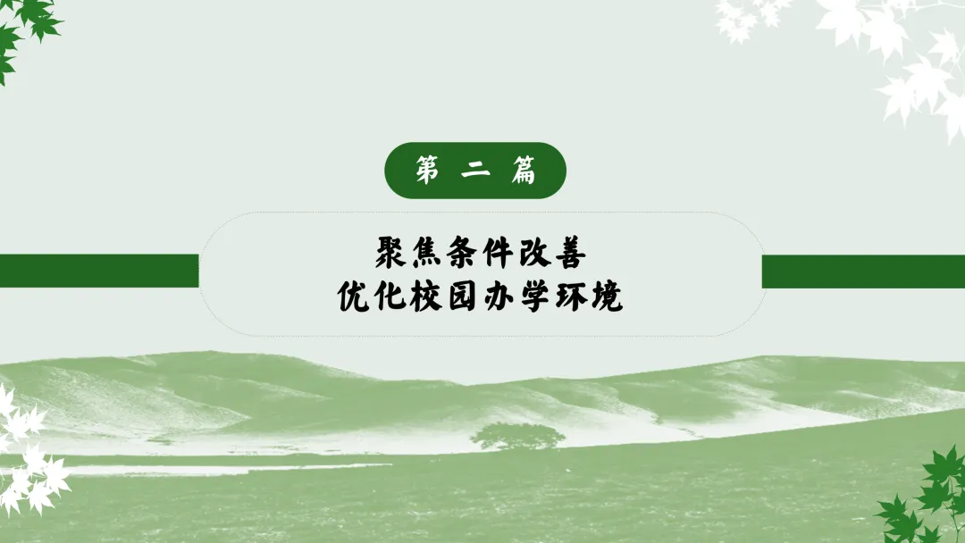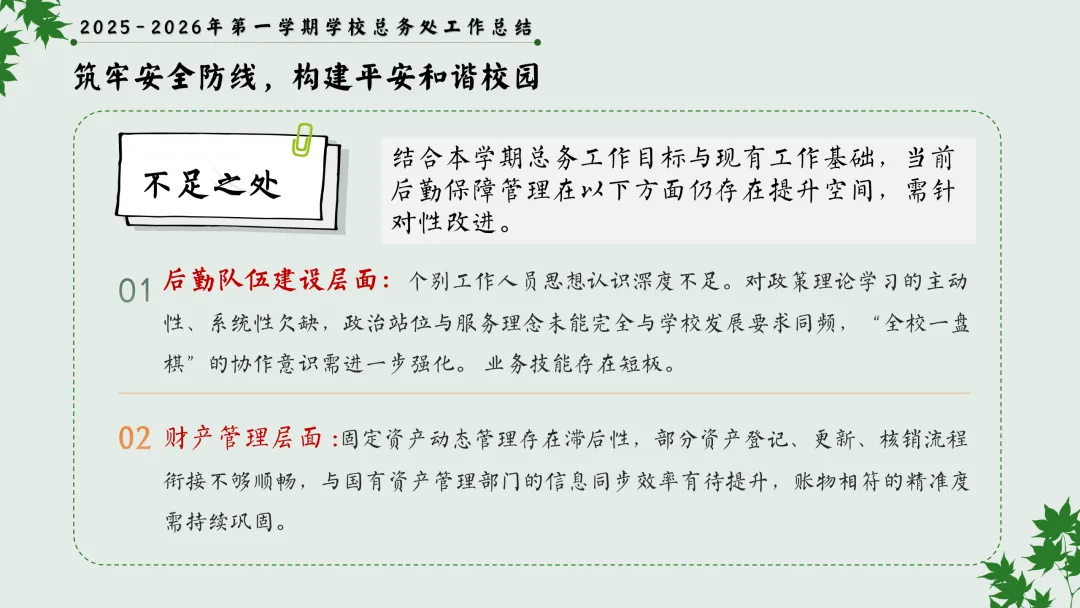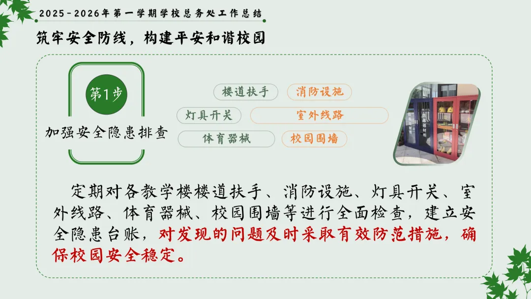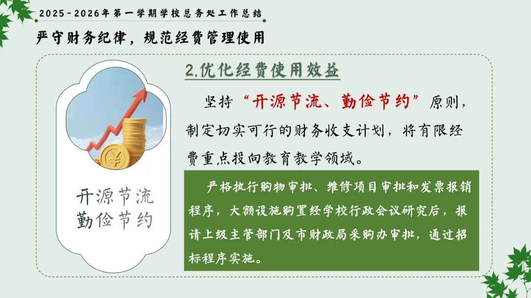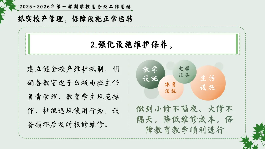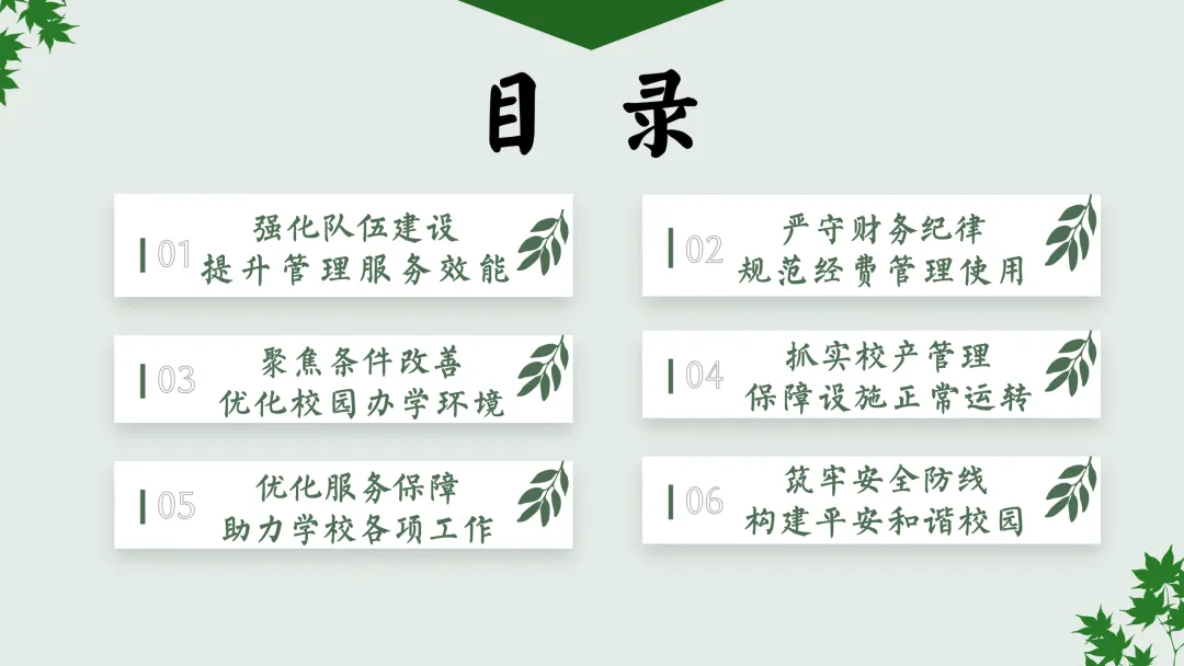 昔日磨砺,今朝绽华;笃志奋进,硕果累累。本学期,总务处紧紧围绕学校发展大局,秉持“规范、节约、周到、及时”的服务宗旨,严格遵守各项管理制度,认真执行学校决策部署,团结协作,积极为学校管理与建设建言献策,努力营造和谐、安全、文明、卫生的校园环境,为教育教学工作的顺利开展提供了坚实支撑。