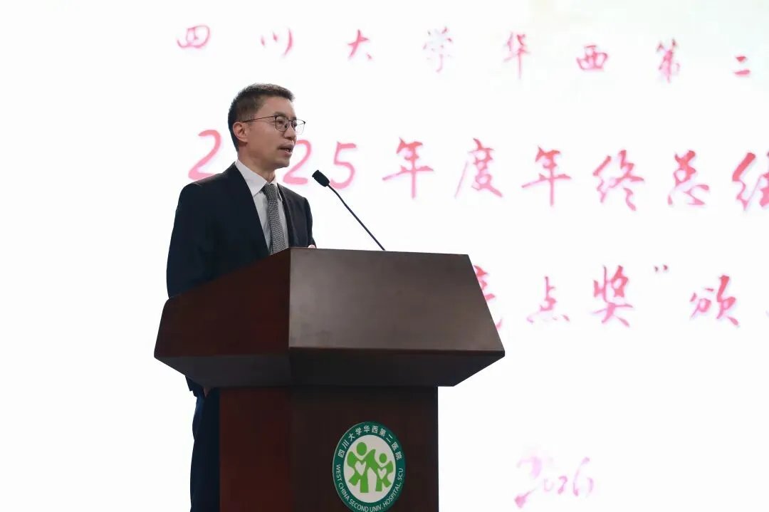 2026年2月4日,四川大学华西第二医院2025年度工作总结会暨“十大亮点奖”颁奖会在锦江院区后勤综合楼2楼多功能厅隆重举行。全体在院院领导、刚离任院领导、学术院长、两委委员、学科主任、国字号人才、全体中层干部、派驻至全托管医院的院领导及中层干部、派驻至领办型医院的院领导、四川华西妇幼健康科技有限公司负责人、民主党派及无党派人士代表、职工代表参会,各部门、科室同步直播。会议由常务副院长王晓东主持。