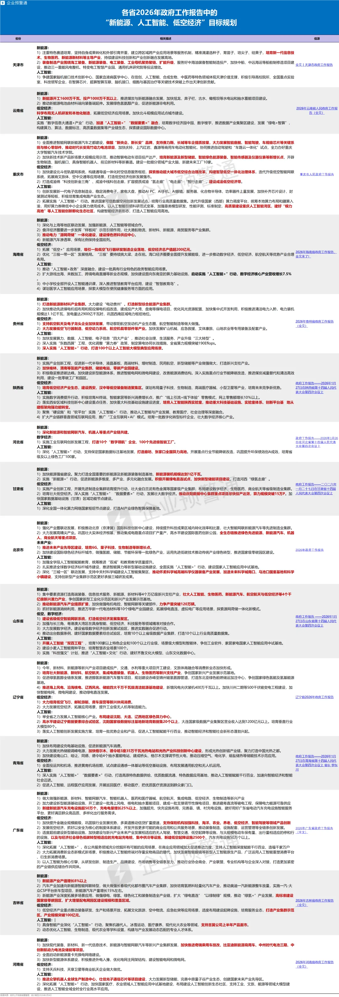 2026年作为“十五五”开局的关键节点,各省(市)政府工作报告纷纷聚焦科技创新与产业升级,新能源、人工智能、低空经济三大新兴产业成为高频关键词,成为各地培育新质生产力、构建现代化产业体系的核心抓手。