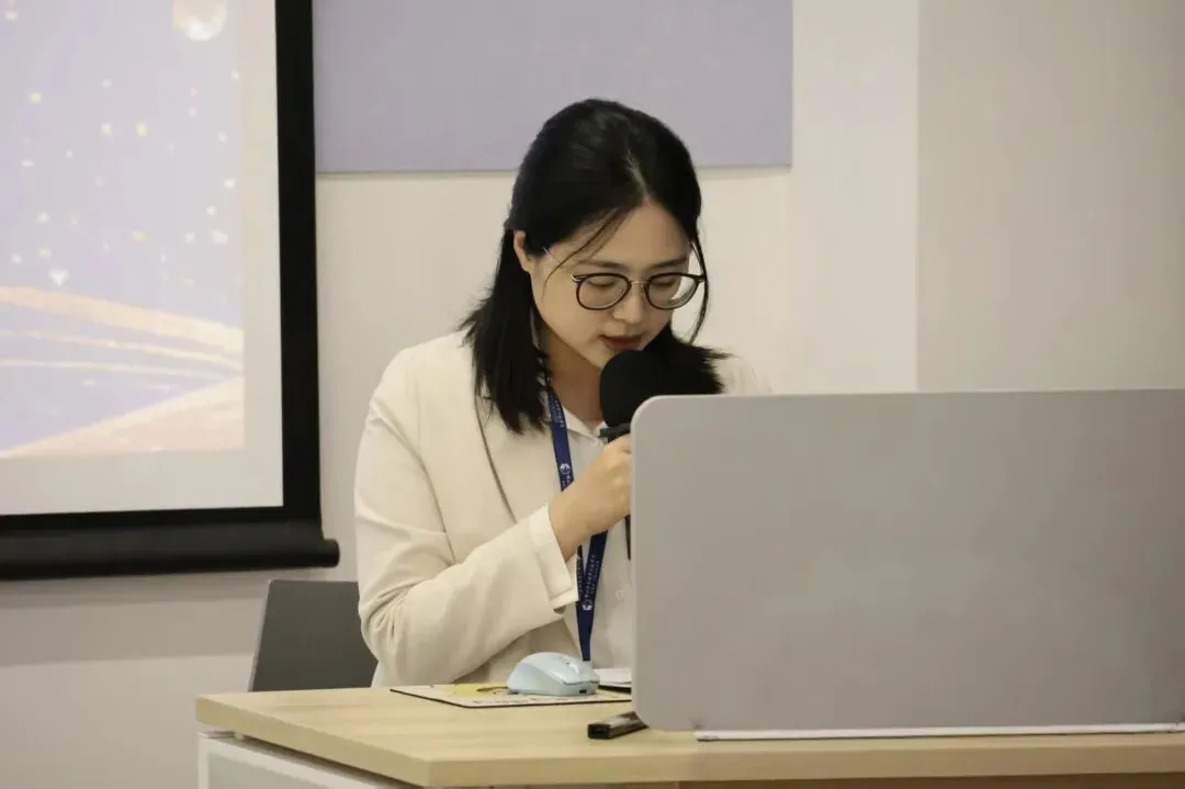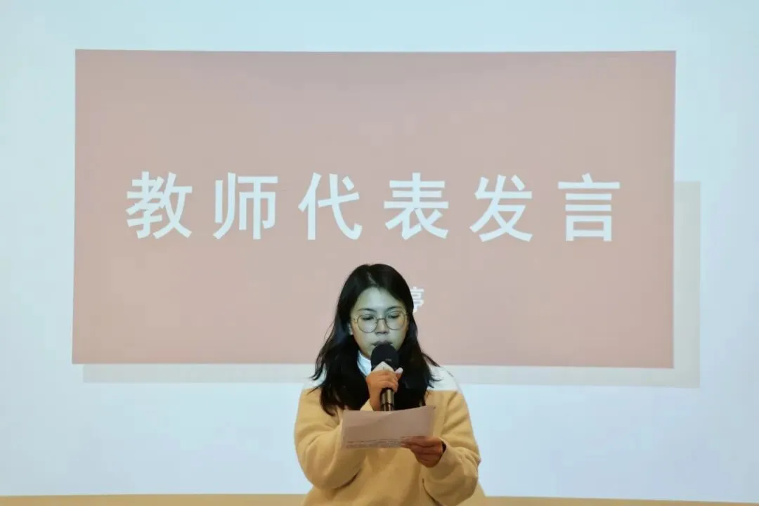 教师代表袁海婷老师首先上台,她结合自身教学实践,分享了在课堂教学、学生辅导方面的感悟与收获,表达了对教育工作的热爱与对未来的信心。