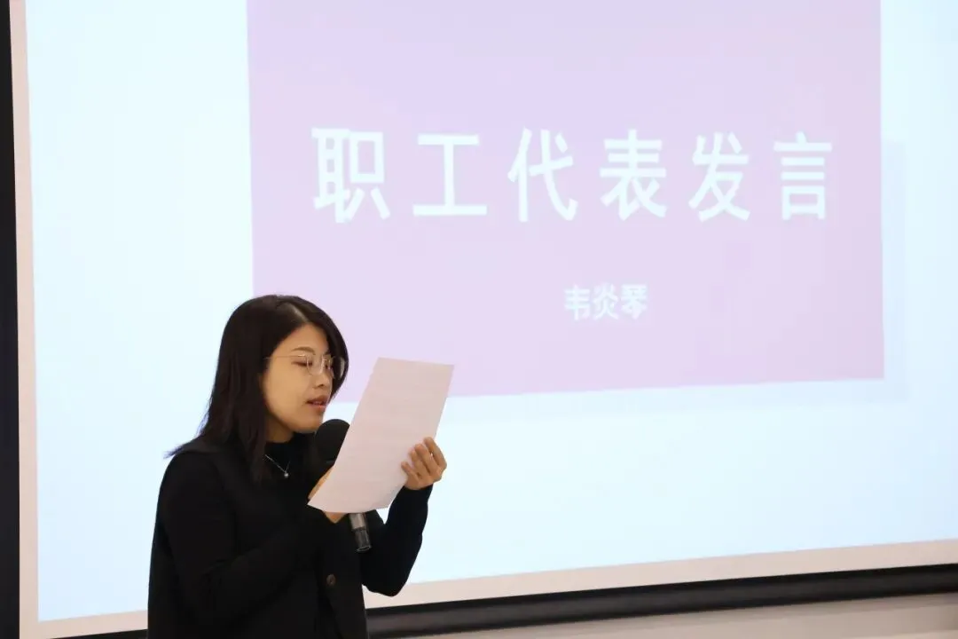 职工代表韦炎琴老师随后发言,她从行政支持与后勤保障的角度,讲述了服务师生、保障教学的点滴故事,体现了岗位上的坚守与奉献。