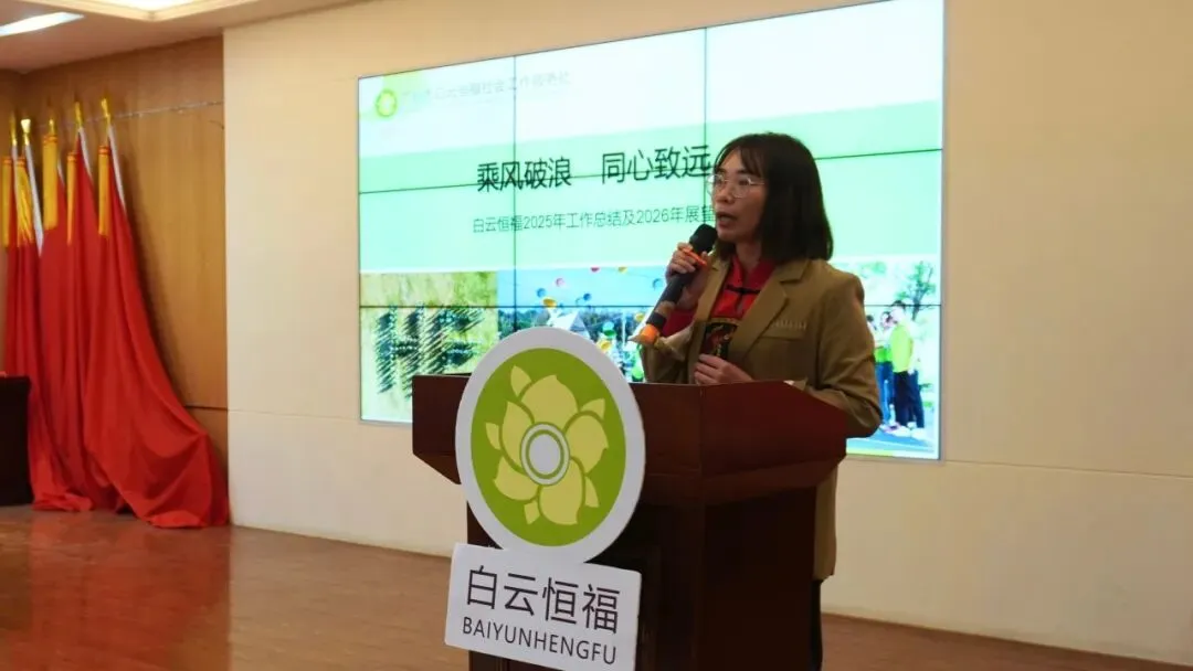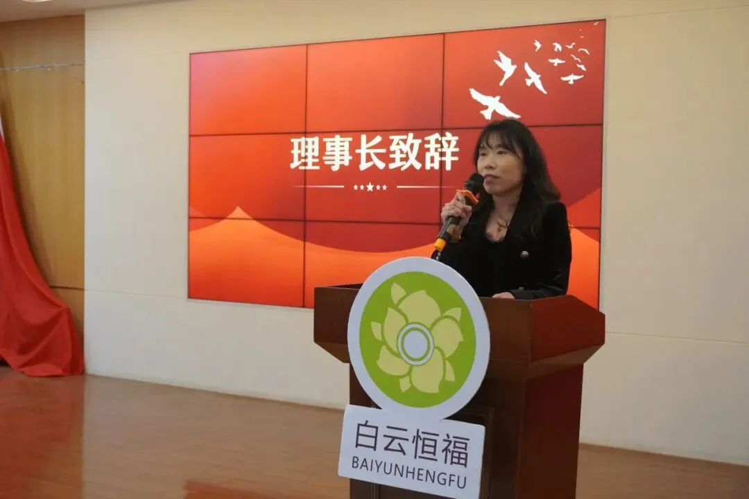 随后,白云恒福理事长毛贵盈发表致辞。她向长期支持机构发展的各级领导、合作伙伴致谢,也向每一位辛勤付出的恒福人送上诚挚问候。她指出,过去一年,白云恒福锚定中心工作,扎实推进各项服务任务,在重点领域斩获积极成效,充分彰显了团队的专业能力与责任担当。面向未来,机构将坚守服务宗旨,深化服务内涵,优化队伍建设,努力在服务社会、服务群众中发挥更大作用。
