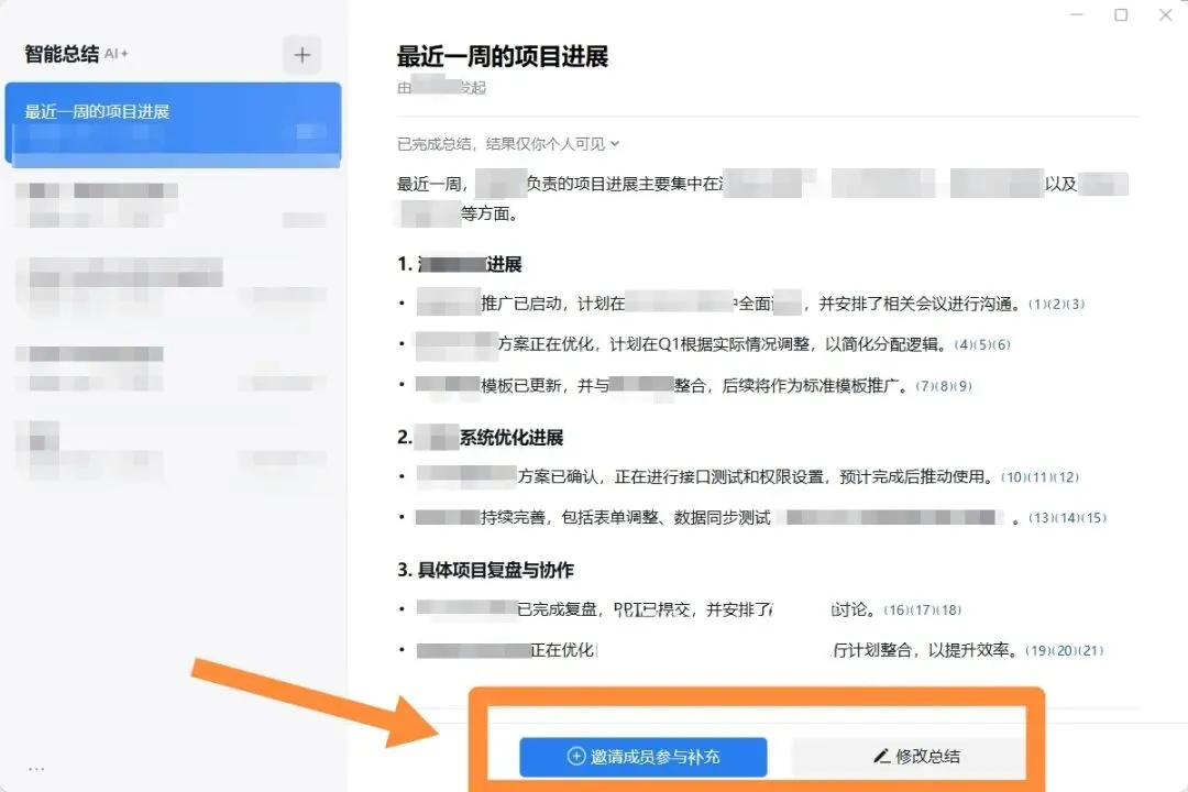 每周写工作总结/项目进展的同学们,如果日常使用企业微信办公,可尝试【智能总结】功能,从聊天、邮件、文件中一键总结,支持邀请团队成员一同修改