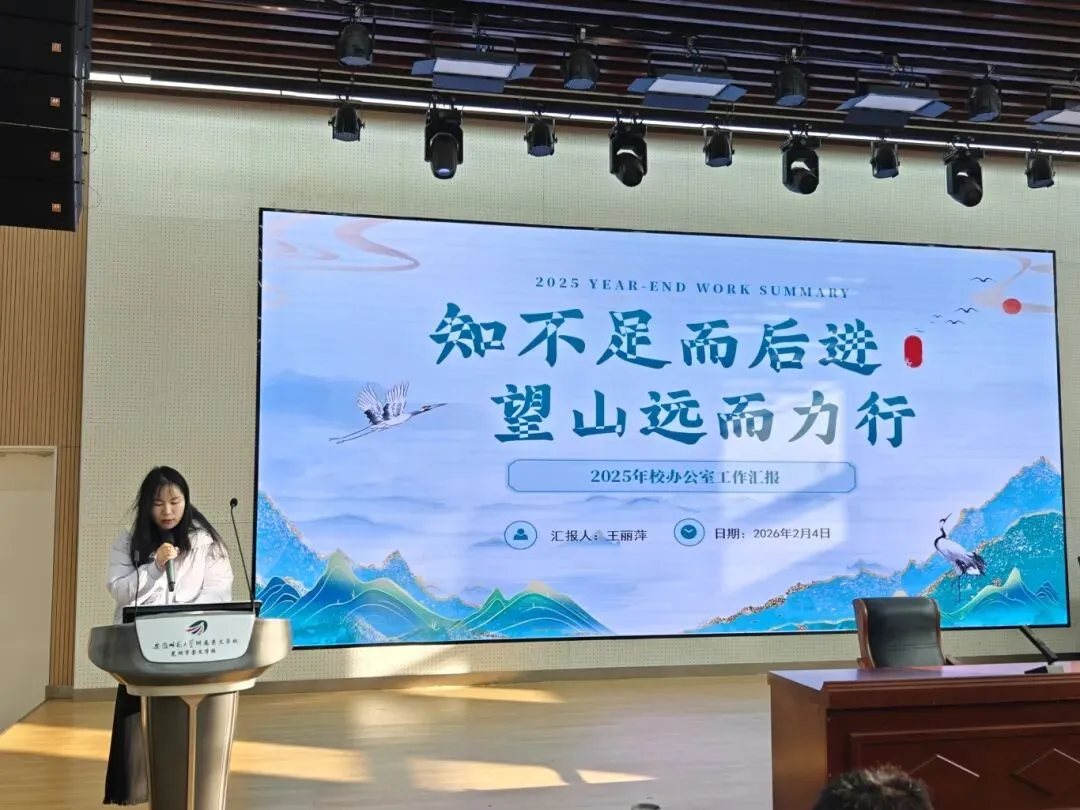 为全面梳理2025年度学校各项工作的推进情况,深入总结发展过程中的宝贵经验,进一步明确新一年度的工作方向与发展目标,2026年2月4日,我校在报告厅召开2025年度工作总结会,会议由学校办公室副主任王丽萍主持。