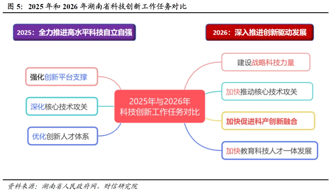 创新的深度和广度决定未来发展的高度和纬度。报告对2026年科技创新工作的部署,最鲜明特征是更加突出关键核心技术自主可控,更加强调从实验室到生产线的全链条贯通(见图5)。这标志着湖南创新实践正从“建平台”转向“生能力”,围绕提升自主创新能力展开系统性重构。