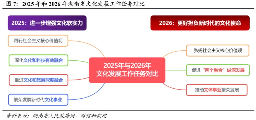 报告部署了三大关键举措:一是以“两个融合”协同构建产业闭环。报告将去年分述的两个融合整合提升为“促进‘两个融合’纵深发展”一个整体,旨在强化其协同效应,构建“科技赋能文化创作-文化创新升级旅游体验-旅游产业反哺文化创新”的价值实现闭环。二是以“文化新质生产力”锻造硬核产业。报告首提“培育文化领域新质生产力”与“推动音视频装备制造业集群发展”,并在创新驱动章节强调“加快培育文化科技领域国家级创新平台”,这意味着依托我省扎实的产业基础,“文化+科技”融合将为优势文创产业注入技术内核与高端制造附加值,推动产业价值链向高端攀升。三是以“场景与品牌”激活并释放消费潜力。报告将文旅发展落脚于具体的消费场景创造与品牌价值提升。对内,通过建设“大张家界国际旅游区”、办好“湘超”群众体育赛事等,打造可体验、可参与、可消费的新场景,2025年“湘超”赛事直接带动相关文旅消费超136亿元;对外,通过推动“湘字号”文化精品出海,提升省域文化品牌的国际辨识度与吸引力,拓展文化消费的市场边界。