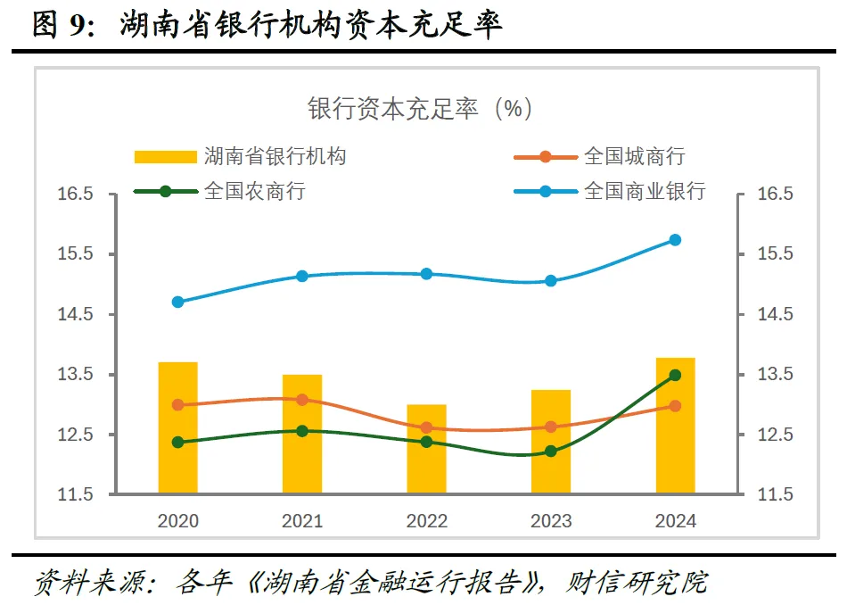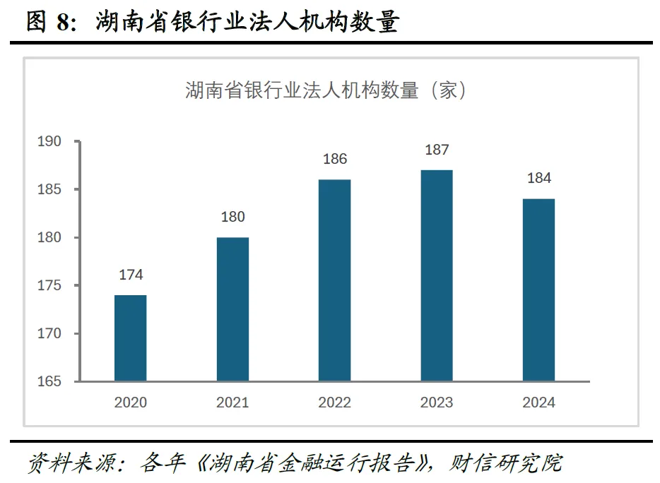 “减量”是手段,更是风险出清的明确信号。部分高风险村镇银行、农村信用社将加速退出市场,方式包括合并重组、市场化退出甚至收购承接,这绝非简单的机构数量收缩,而是打破“规模小—抗风险弱—经营差—风险高”恶性循环的攻坚战。截至2024年末,湖南中小银行超百家,但资产规模过万亿者仅长沙银行一家,部分机构资本补充压力加大,数量压降已进入实质性操作阶段(见图8-9)。