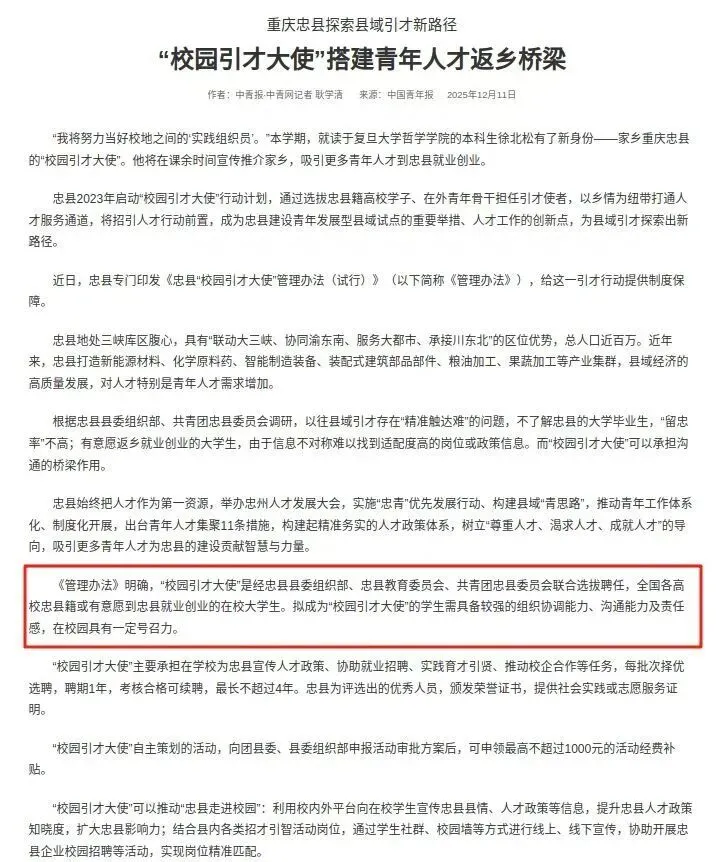 青年因城市而聚,城市因青年而兴,过去一年,县委、县政府高度重视青年发展型城市建设。县委常委会会议多次研究青年发展相关工作,迭代升级《忠县建设青年发展型城市实施方案》,县委主要领导召开专题会议研究青年发展型城市建设,县委分管领导多次调度推进各项重点任务。“假期公益托管”“关心青少年心理健康”等青少年发展项目作为2025年县级重点民生实事并推动落实。