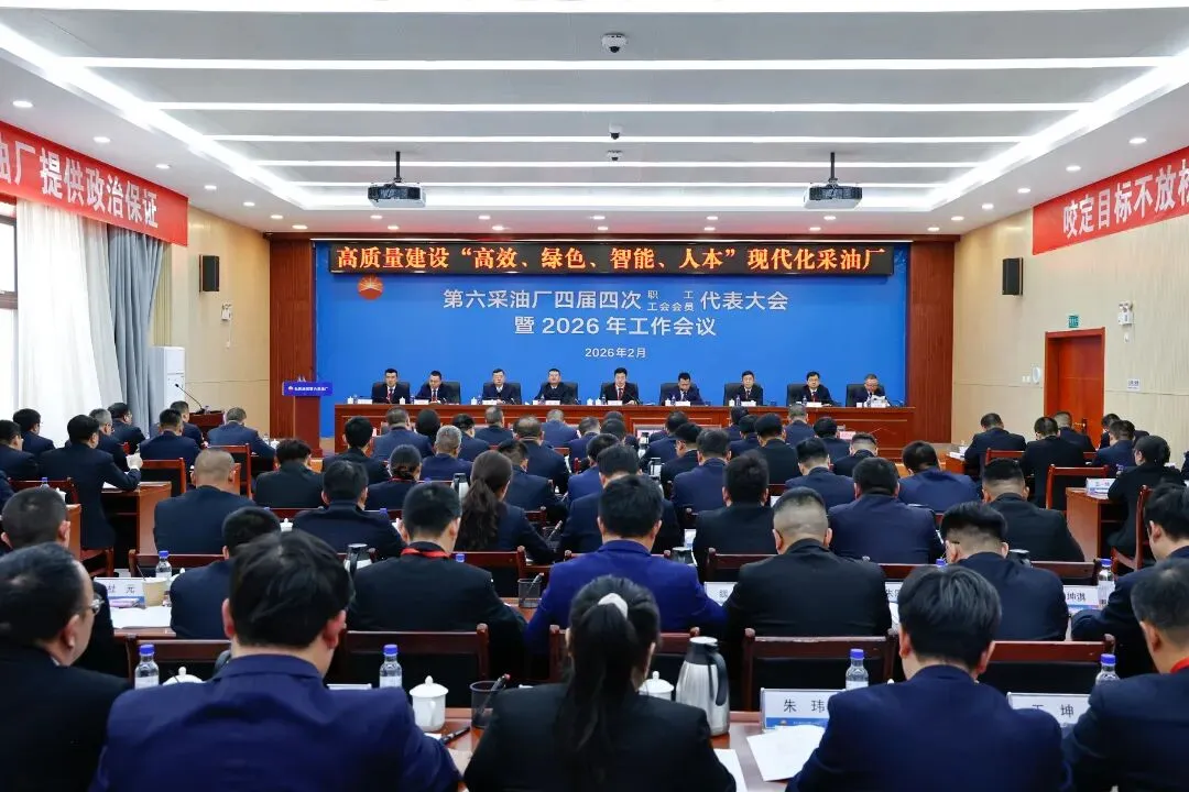 2026年2月5日,采油六厂四届四次职工(工会会员) 代表大会暨2026年工作会议在定边基地隆重召开。党委书记、工会主席、副厂长赵爱彬作题为《党建引领聚合力 融入中心促发展 为建设现代化采油厂提供政治保证》的党委工作报告。