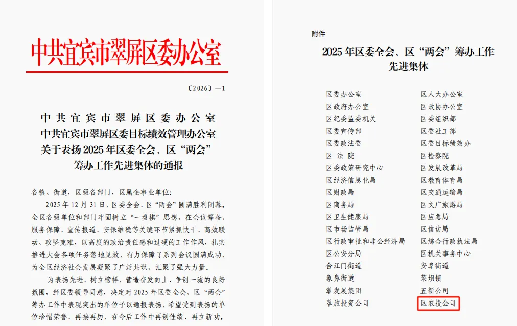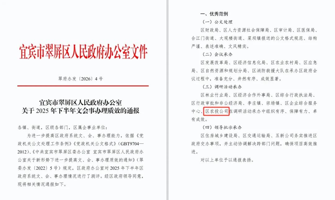 区农投公司在调研活动承办中组织有序、保障有力、卓有成效,宜宾市翠屏区人民政府办公室对区农投公司予以通报表扬。