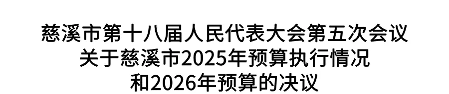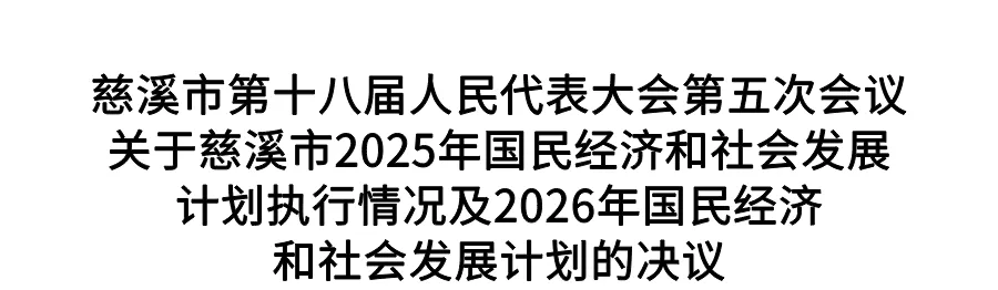 慈溪市第十八届人民代表大会第五次会议听取和审议了章程市长所作的政府工作报告。会议充分肯定市人民政府2025年所做的工作及取得的成效,同意报告提出的2026年全市经济社会发展主要目标、重点任务和工作举措,决定批准这个报告。