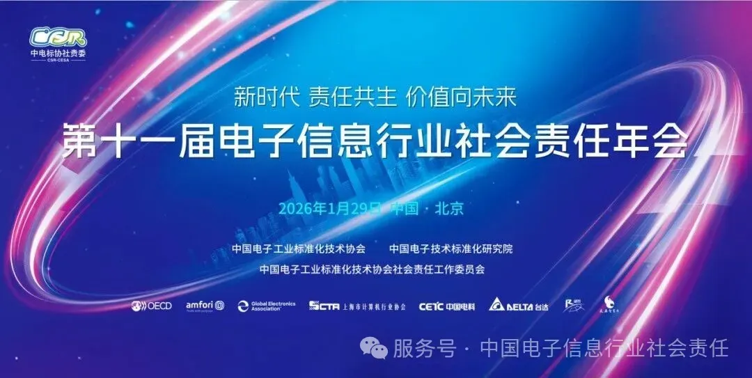 第十一届电子信息行业社会责任年会暨中电标协社会责任工作委员会年度会员大会,在中国电子工业标准化技术协会、中国电子技术标准化研究院、中电标协社会责任工作委员会、中国电科、台达等政产学研用媒各界共同努力下,于2026年1月29日在京成功举办。本届年会得到了经济合作与发展组织(OECD)、全球贸易协会(amfori)、全球电子协会(GEA)、上海市计算机行业协会、电子信息行业社会责任与可持续发展智库、融智企业社会责任研究院、灵石智享库、责扬天下等单位的大力支持。