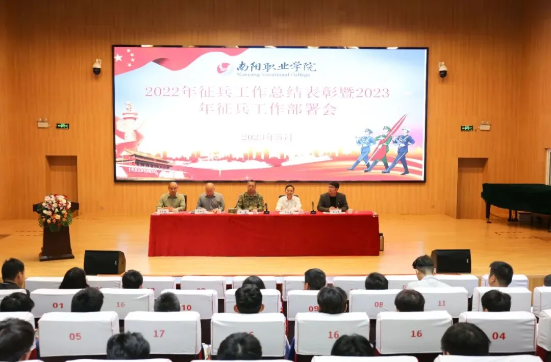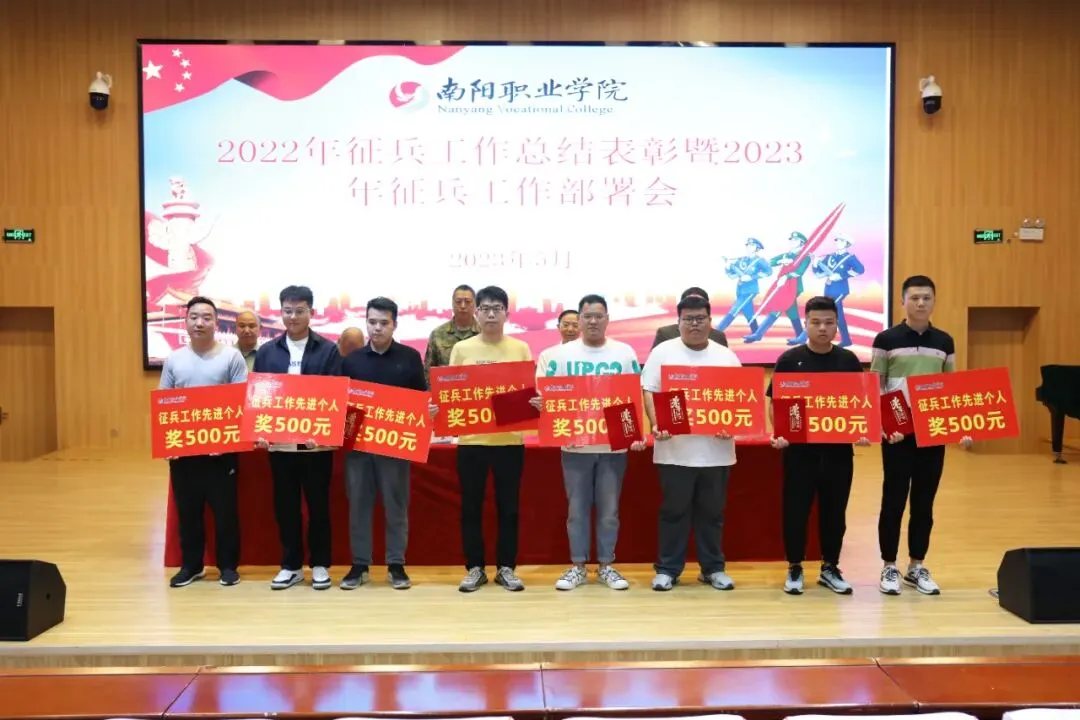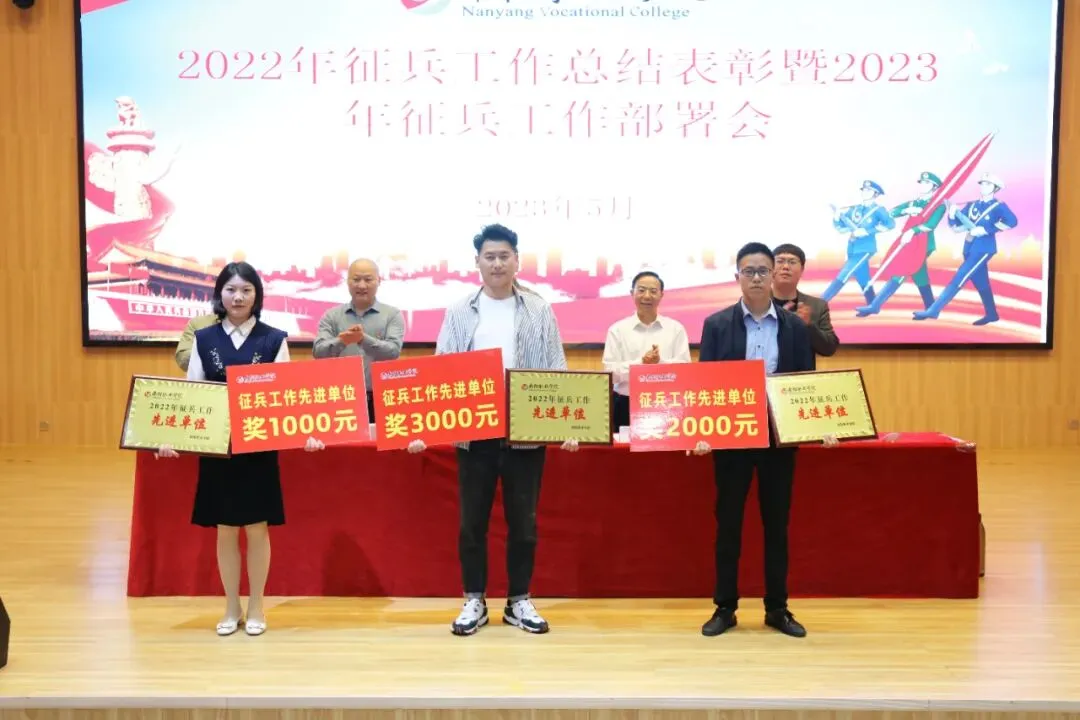 主席台领导分别为先进单位和先进个人颁发奖牌和证书。会议期间,洪立伟宣读了《南阳职业学院2023年征兵工作方案》,按照方案要求,给各学院下达今年征兵目标任务,强调廉洁征兵;贾艳晓对2022年征兵工作进行了总结;智能制造技术学院党支部书记陈明航对2022年征兵工作中的思想教育、征兵动员、体检政审、役前训练等好的方法经验进行了分享。
