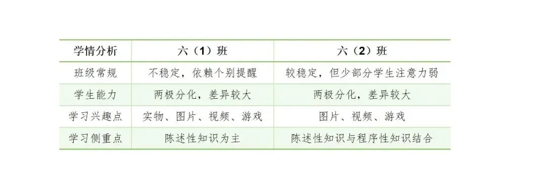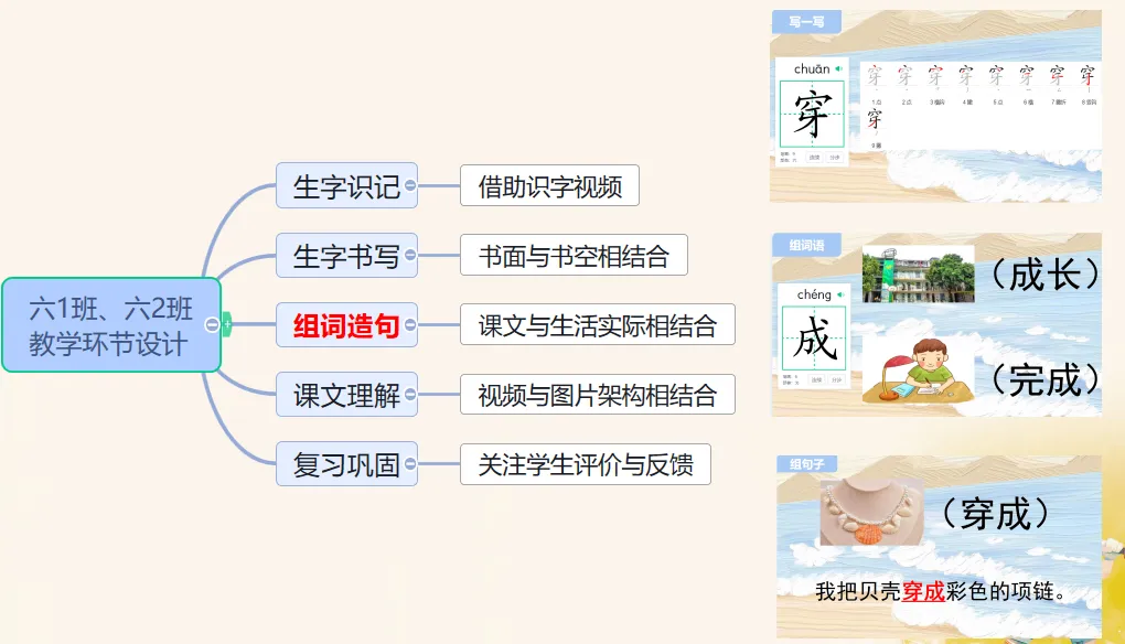 课堂环节设计六1班以生字、词语学习为主,在识字过程中渗透与课文内容相关联的组词和造句,提前链接文本教学内容,降低后续学习的难度;六2班则可以增加词语和句子的拓展,同时联系生活,在课文理解上重视思维训练,运用文字获取和传递信息,通过视频和图片的支架搭建帮助学生在脑海中形成生动的画面,促进理解。