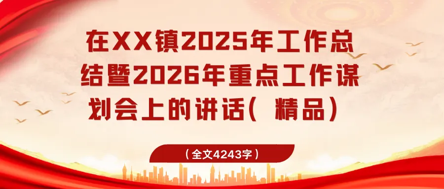 今天,我们召开全镇2025年工作总结暨2026年重点工作谋划会议,主要任务是全面总结过去一年的工作,客观分析当前形势,科学谋划部署新一年的目标任务,动员全镇上下进一步统一思想、凝聚共识、锐意进取,奋力推动XX镇各项事业发展再上新台阶。下面,我讲几点意见。