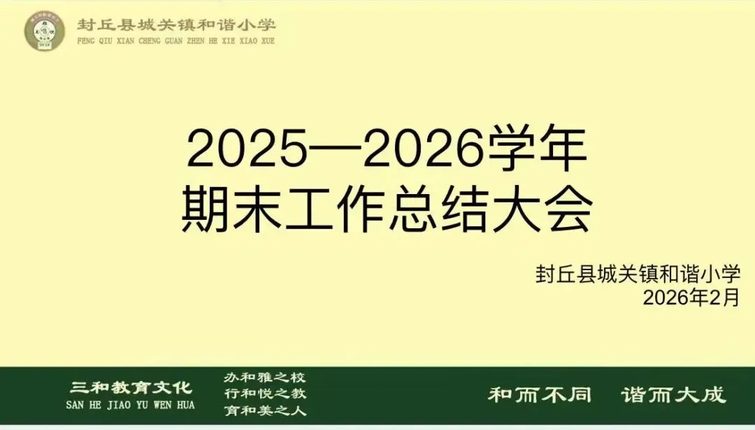 时光镌刻耕耘足迹,岁月见证成长硕果。2026年2月5日,城关镇和谐小学召开2025—2026学年期末工作总结大会,全体教职工齐聚一堂,复盘过往耕耘之路,共赴温暖教育之约,为一学期的工作画上圆满句号。