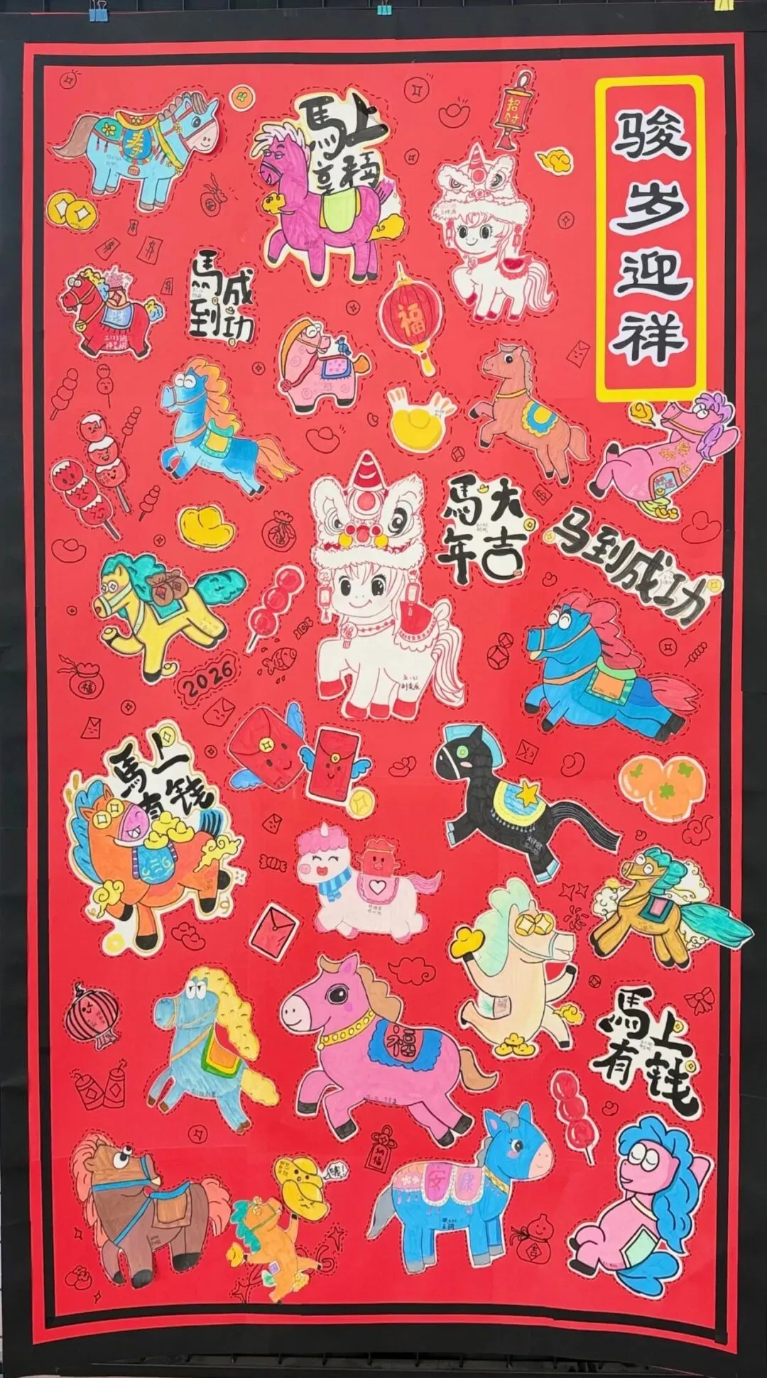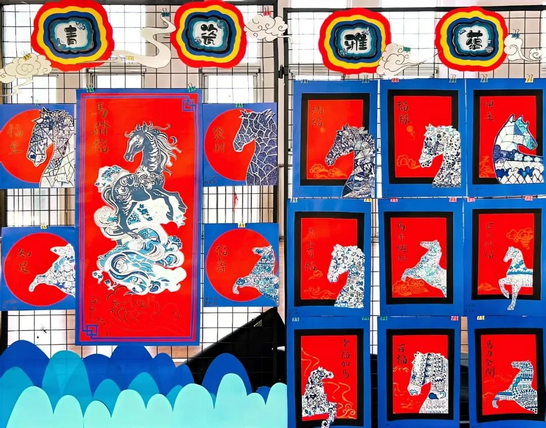 为迎接新年到来,传承非遗文化,我校开展“非遗传承,马踏新途”迎新年画展活动。本次画展围绕红红火火迎新年、年年有鱼、骏岁迎祥等十余项特色小主题展开,涵盖门神、百福图、青瓷雅蕴等非遗元素,也融入五花马、骐骥驰骋等马年意象,琴棋书画、非遗糖画、年夜饭等内容更让作品充满生活气息与传统韵味。