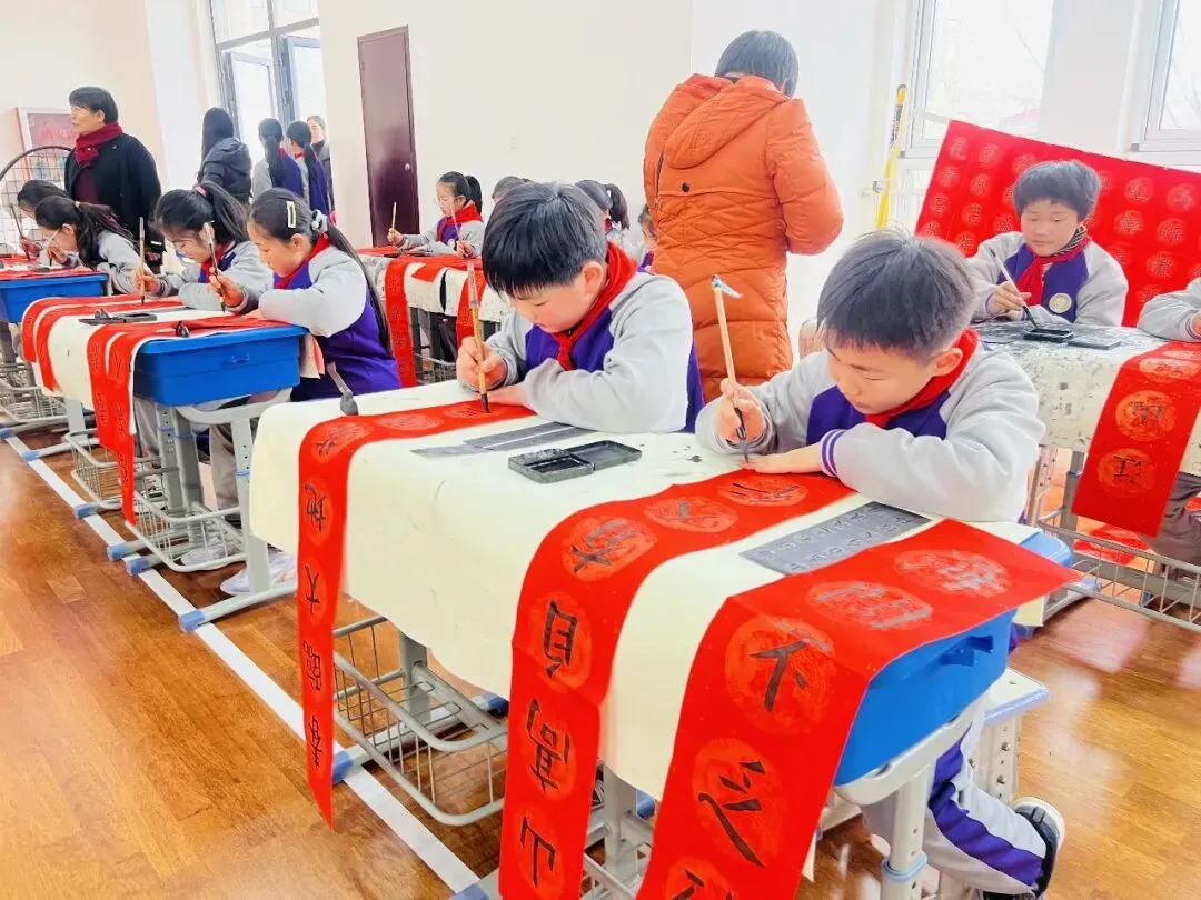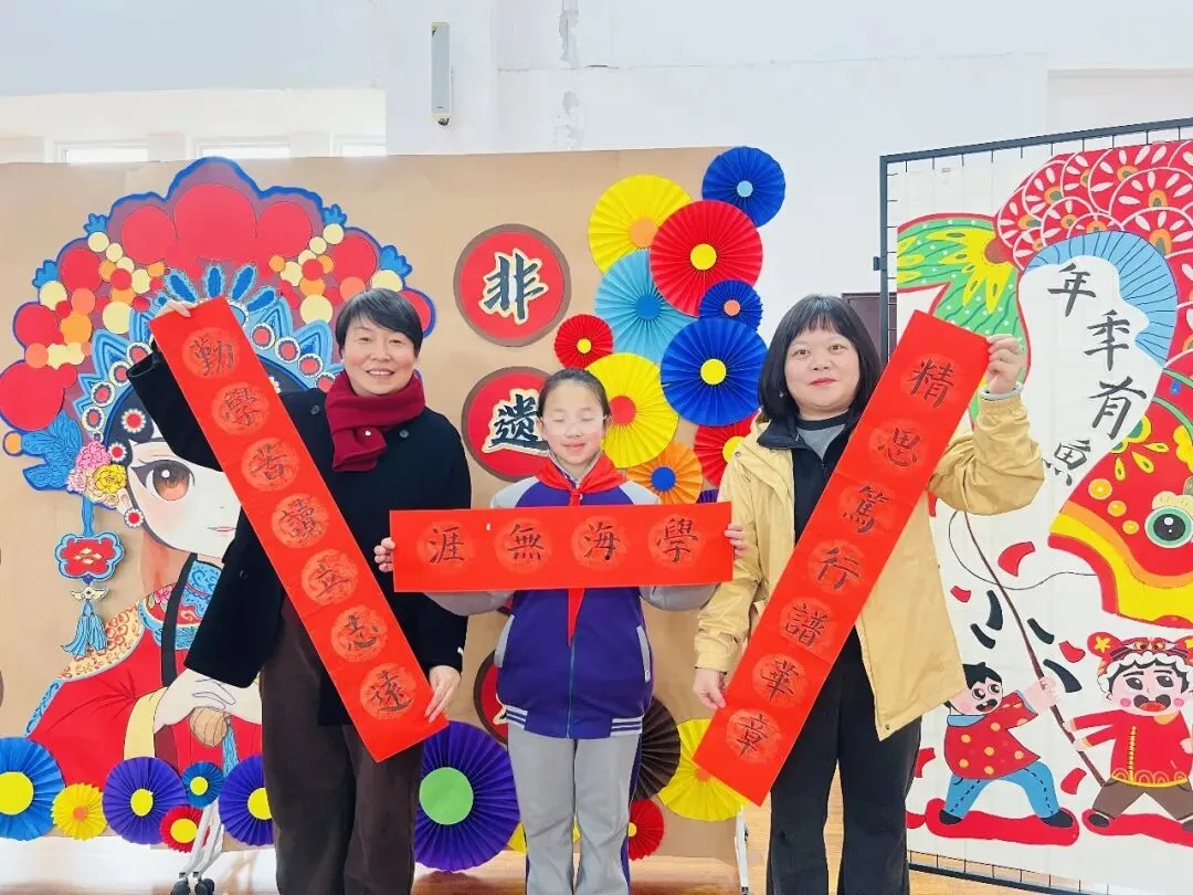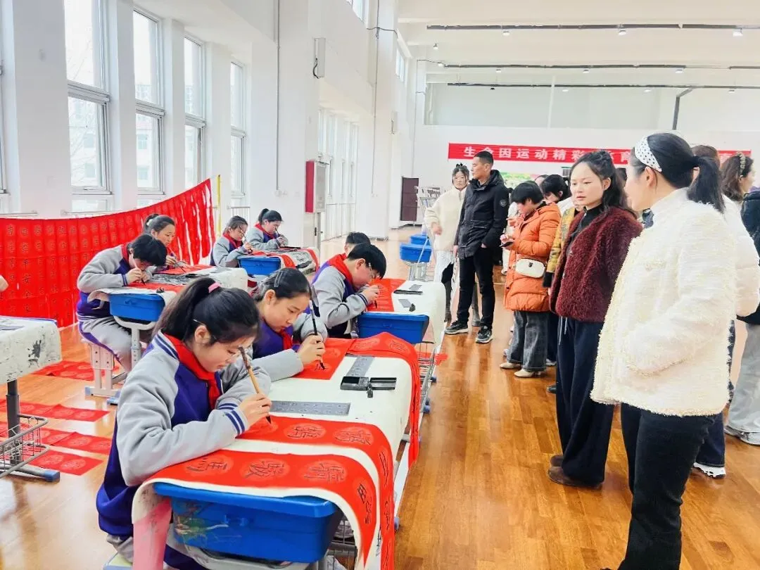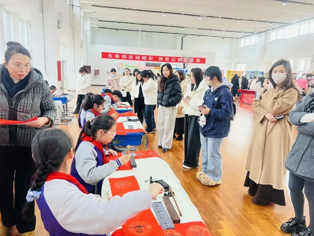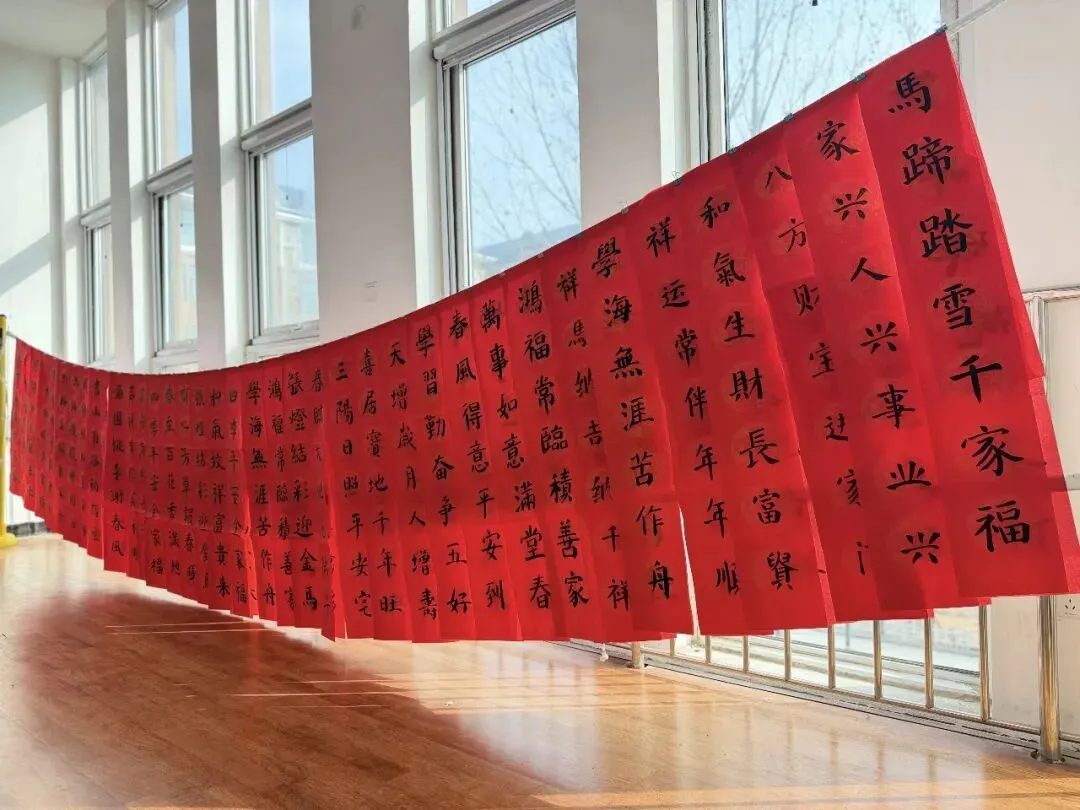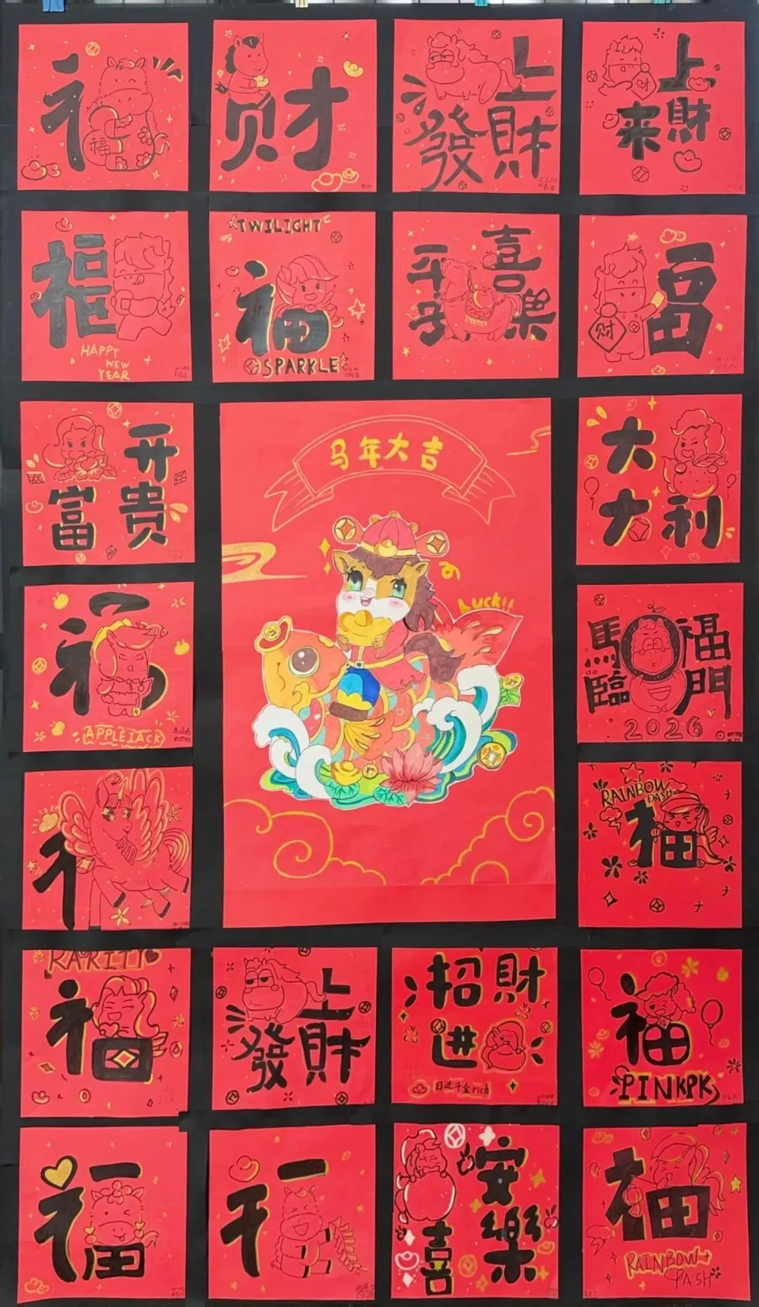 画展现场还邀请家长到场参观,沉浸式感受孩子们笔下的非遗年味与马年新意。学校书法社团的同学们现场挥毫泼墨,书写新春春联并赠予家长,笔墨间满是新春祝福,一撇一捺尽显书法魅力,让家长与孩子共同在墨香中迎接新年,为画展增添了浓浓的节日氛围。