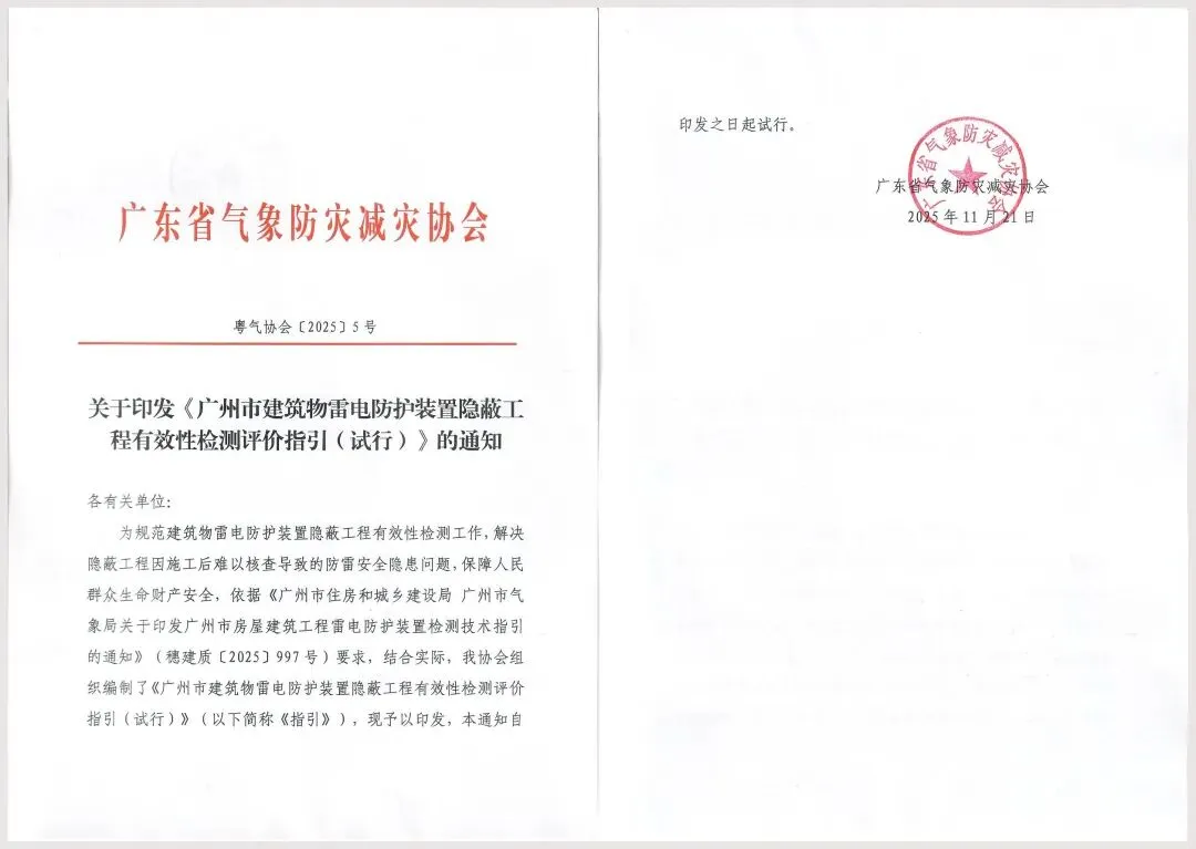组织研究印发《广州市建筑物雷电防护装置隐蔽工程有效性检测评价指引(试行)》,首次系统明确了防雷隐蔽工程检测的评价流程。