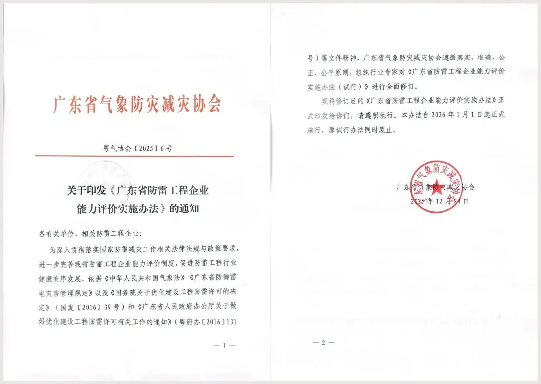 组织专家对《广东省防雷工程企业能力评价实施办法(试行)》进行修订,并于2026年1月1日正式施行。