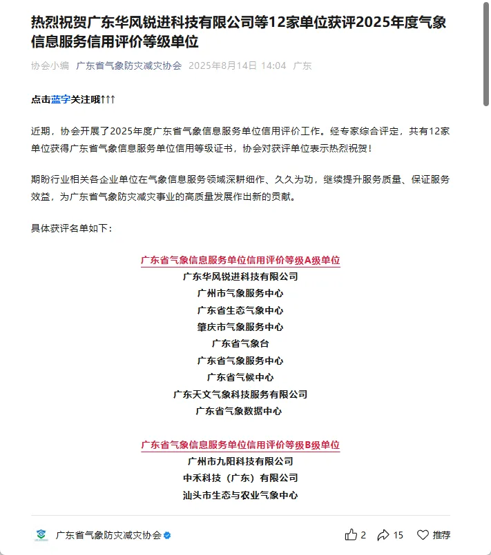 ▲ 广东省气象信息服务单位信用评价获评单位名单