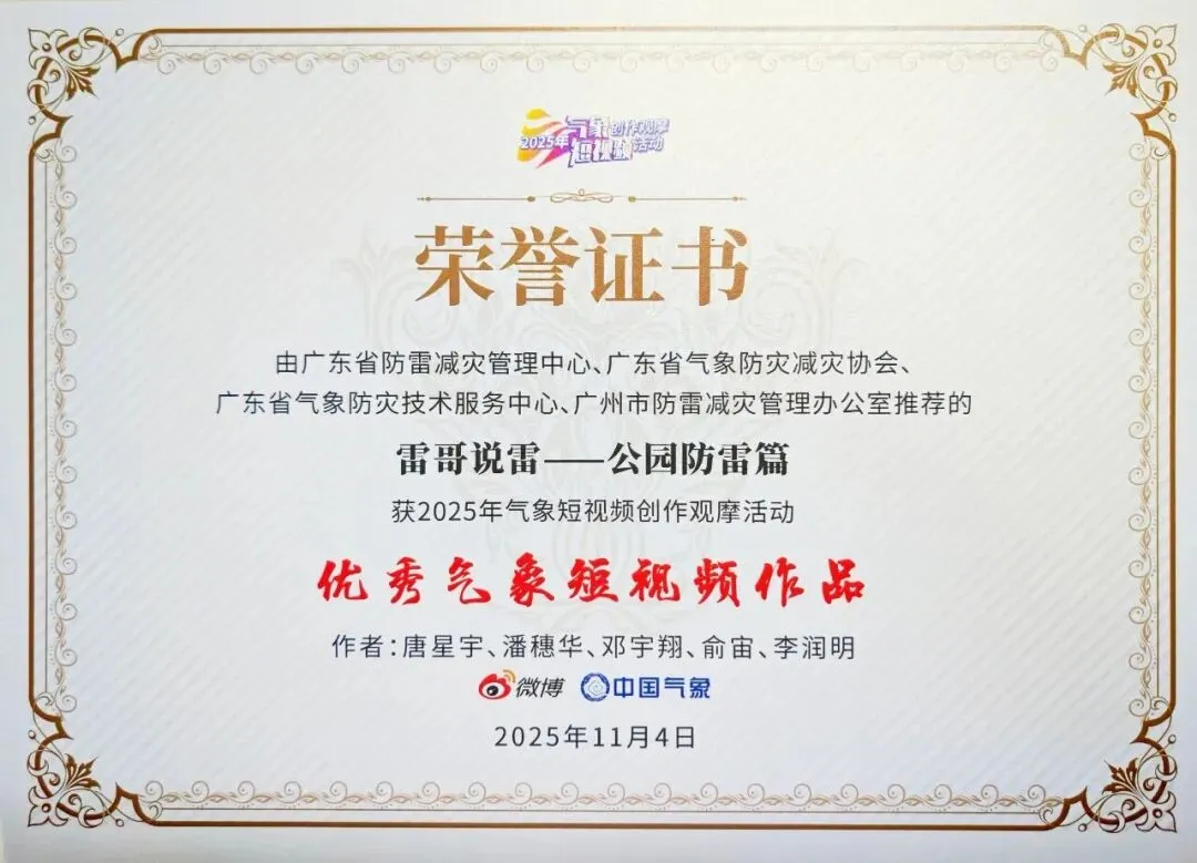 ▲ 气象科普视频《雷哥说雷——公园防雷篇》荣获中国气象局2025年气象短视频创作观摩活动优秀气象短视频作品