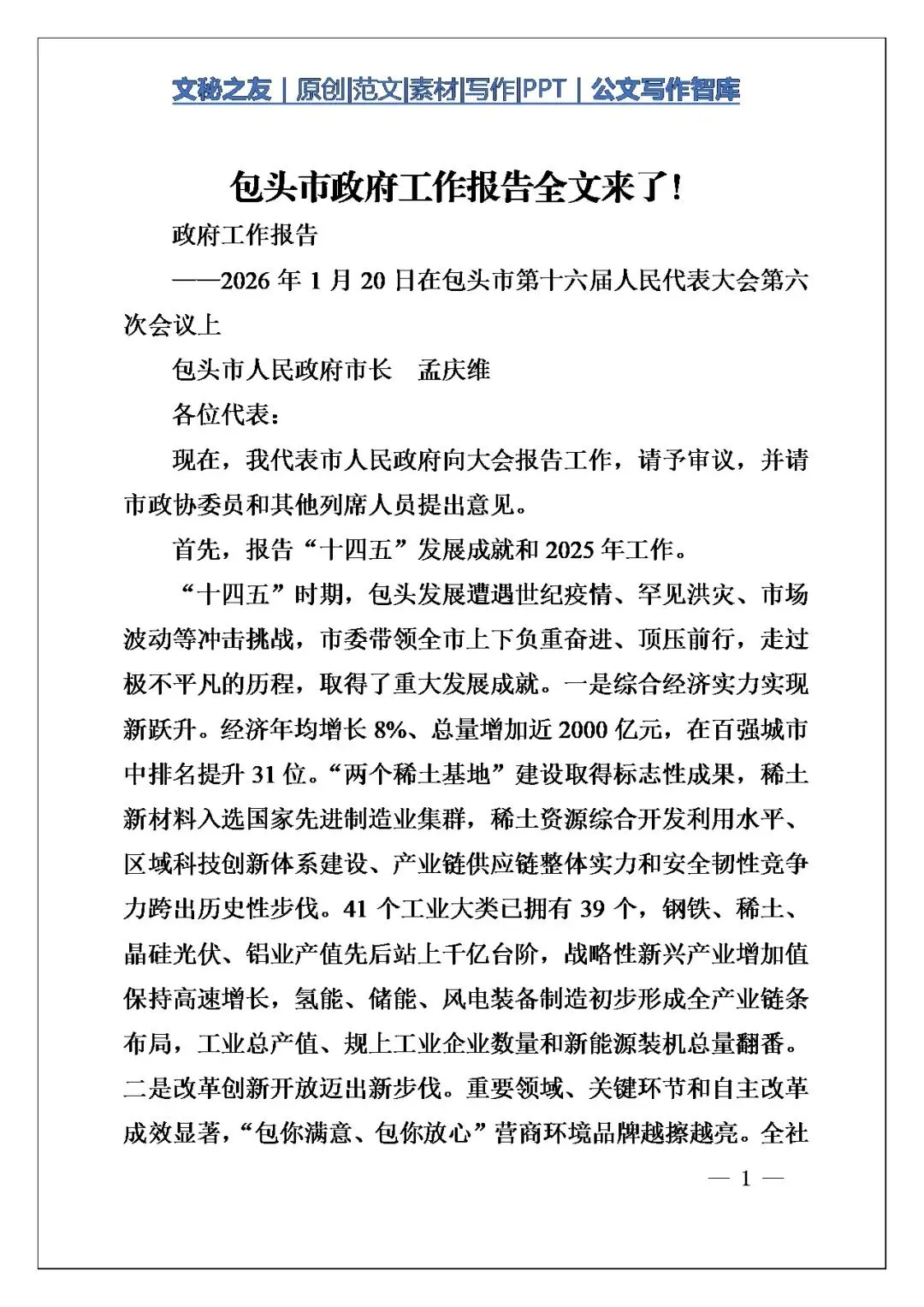 >包头市政府工作报告全文发布