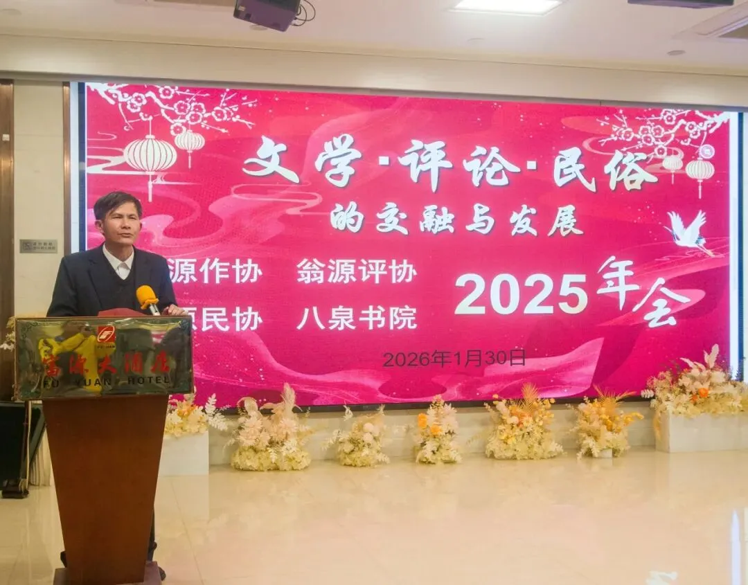 总结会以“文学·评论·民俗的交融与发展”为主题。会上,翁源作协主席、翁源评协主席、翁源民协主任、八泉书院院长黄影祥对四个文艺组织的工作进行了总结和对2026年的工作进行了部署。会员代表黄凯辉、陈水晶、何明辉、曾娴秀等会员在会上发言,畅谈创作体会和用文艺赋能乡村振兴、文明城市建设工作。八泉书院非遗保护部主任胡大勇等会员用扬琴、箫子、二胡共同演奏了《南湖红船》《百千万工程》乐曲。