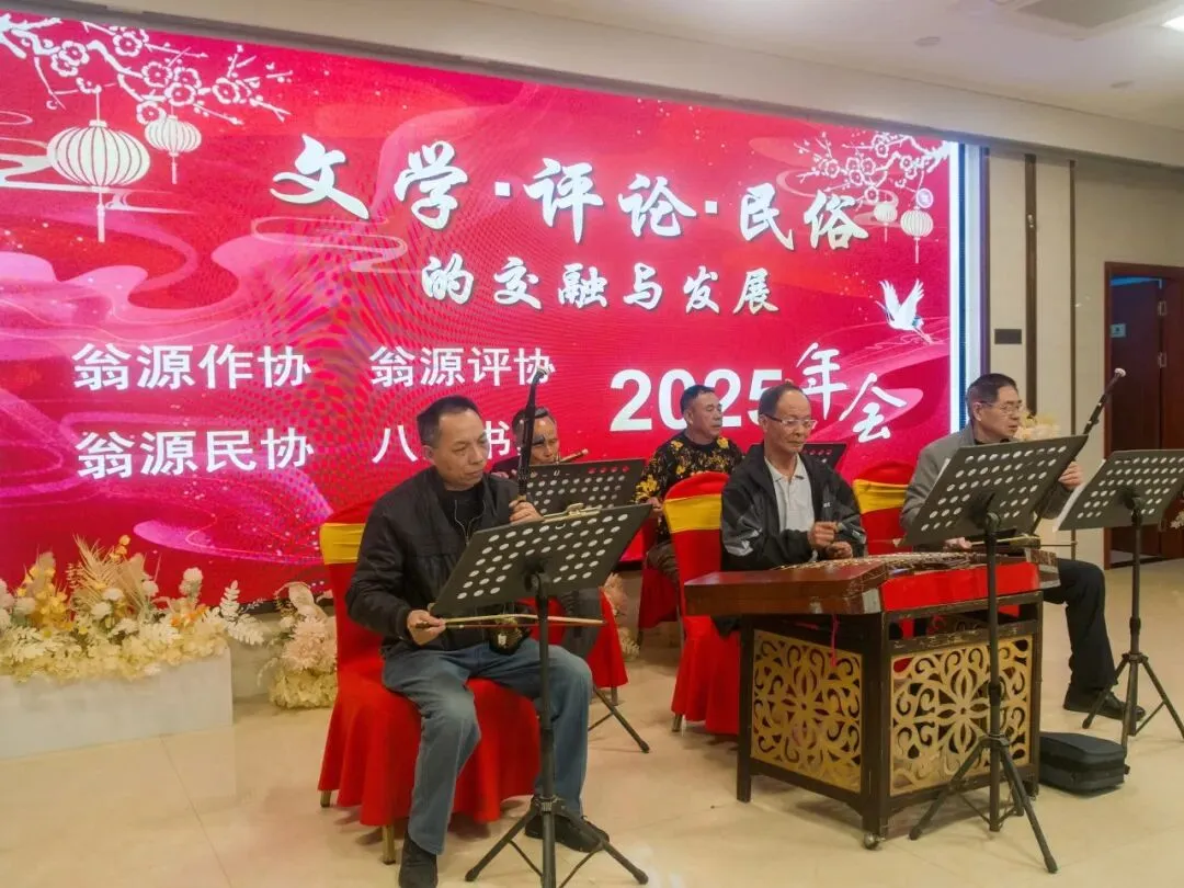 总结会以“文学·评论·民俗的交融与发展”为主题。会上,翁源作协主席、翁源评协主席、翁源民协主任、八泉书院院长黄影祥对四个文艺组织的工作进行了总结和对2026年的工作进行了部署。会员代表黄凯辉、陈水晶、何明辉、曾娴秀等会员在会上发言,畅谈创作体会和用文艺赋能乡村振兴、文明城市建设工作。八泉书院非遗保护部主任胡大勇等会员用扬琴、箫子、二胡共同演奏了《南湖红船》《百千万工程》乐曲。