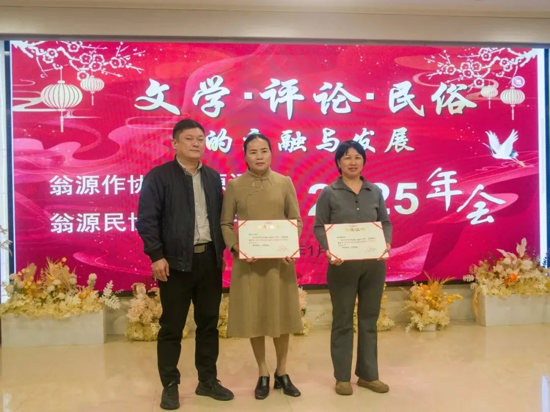 翁源县委社会工作部副部长官俊华为县民协优秀会员郭雪娥、陈桂兰颁奖