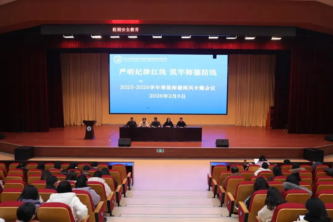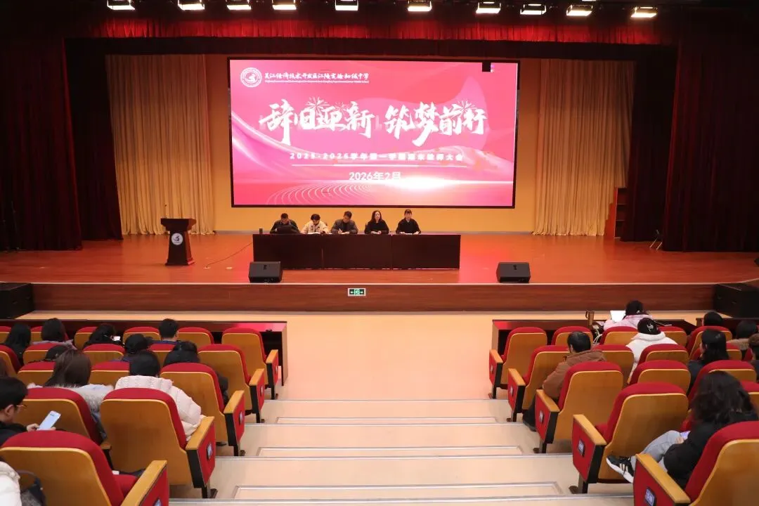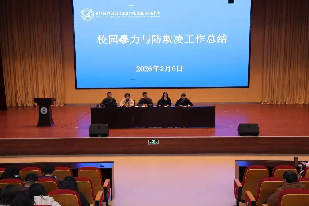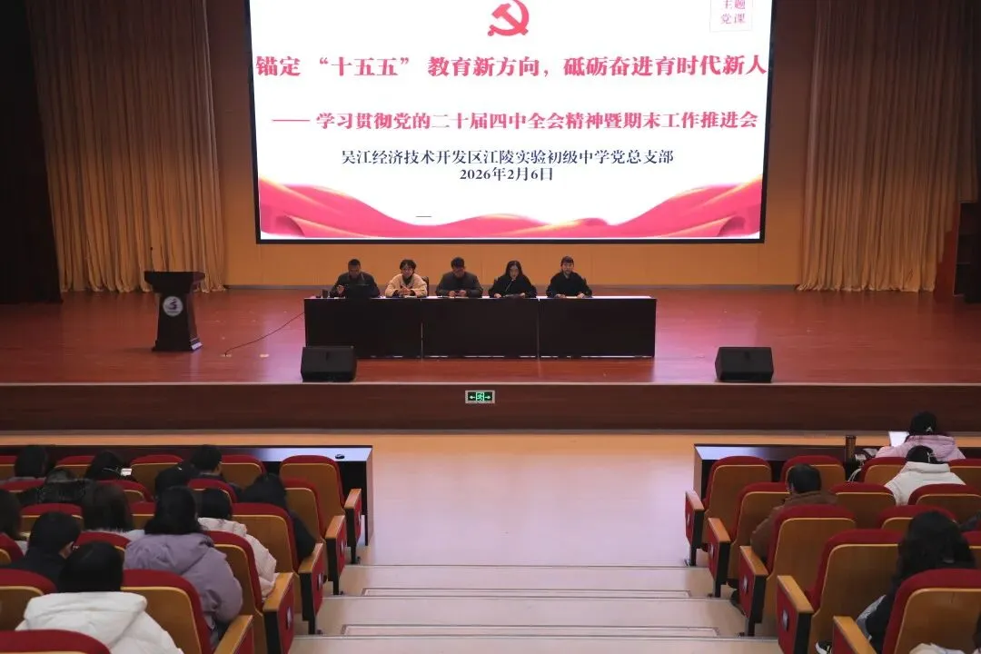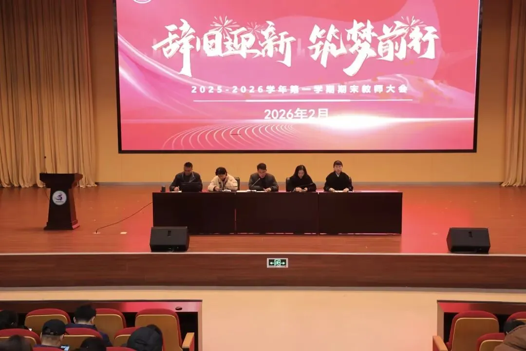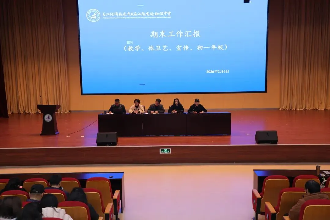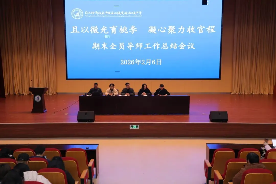 2026年2月7日,江陵实验初中报告厅内洋溢着辞旧迎新的庄重氛围,“辞旧迎新,筑梦前行”期末总结大会在此举行。会议全面回顾与总结了一学期以来学校的重点工作成果,并就师德师风建设与寒假重点工作进行了部署。学校领导班子及全体教职工共同参加了会议。