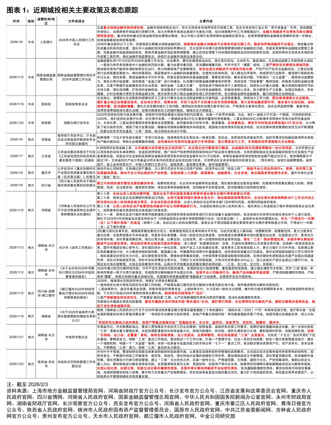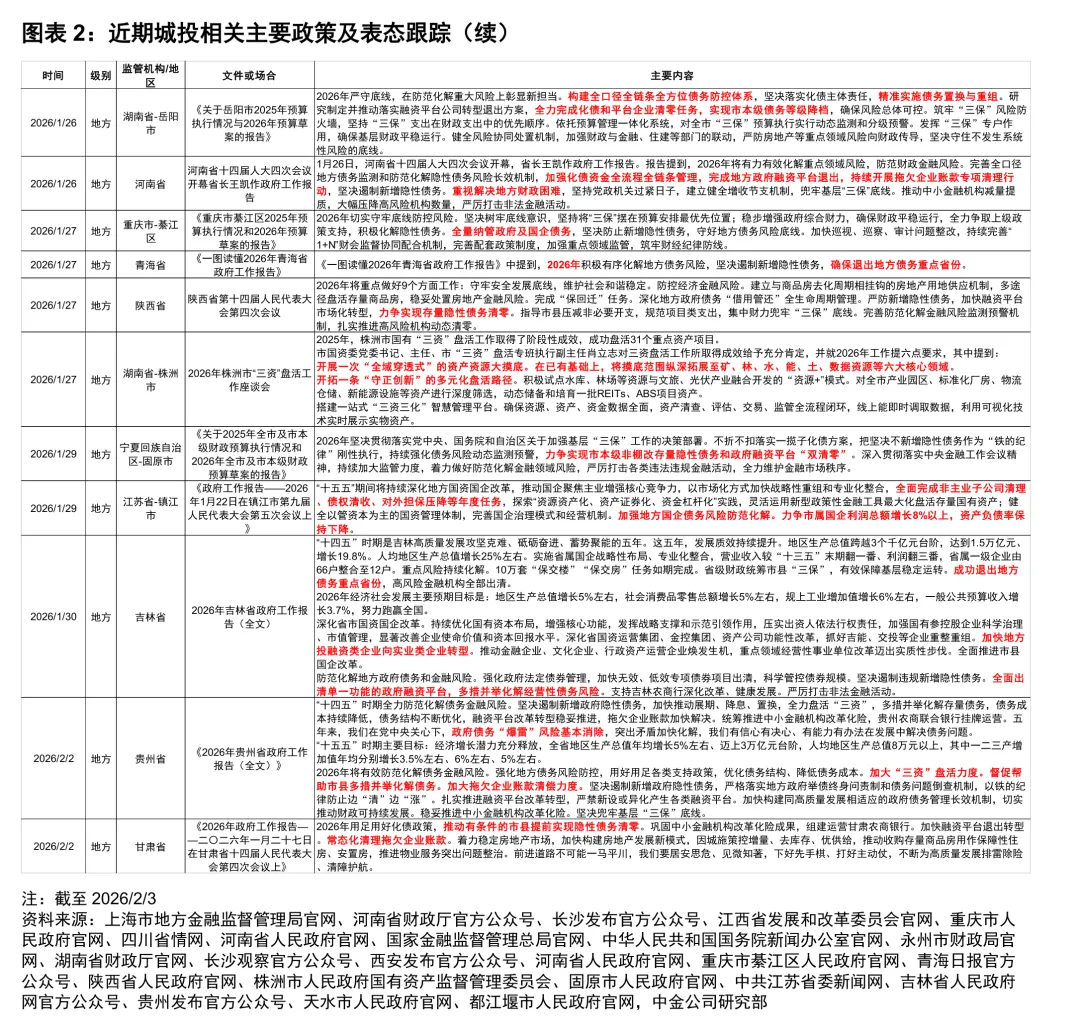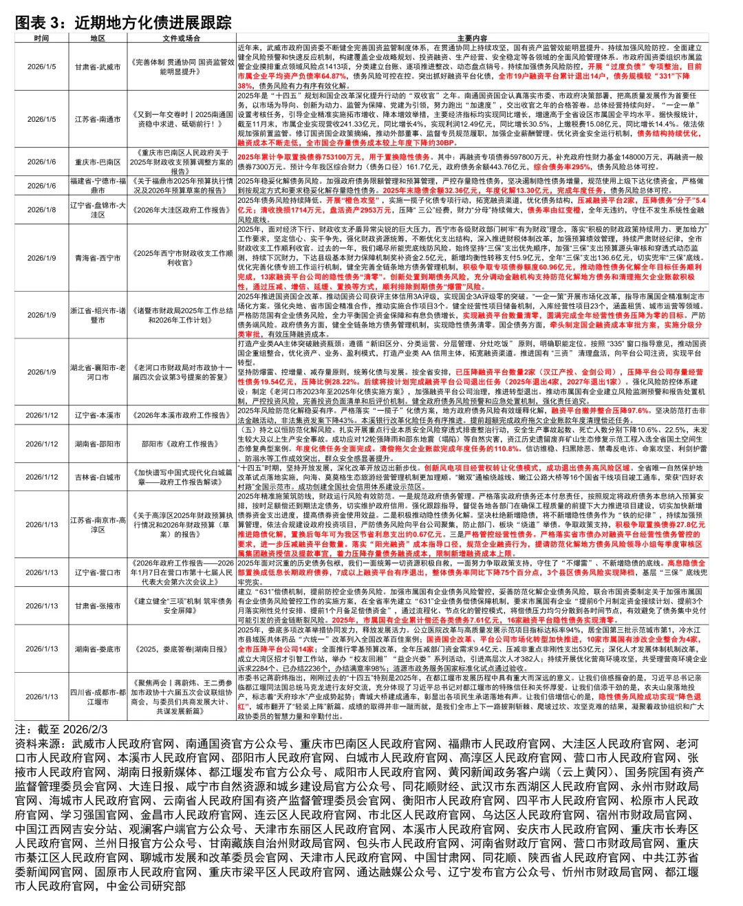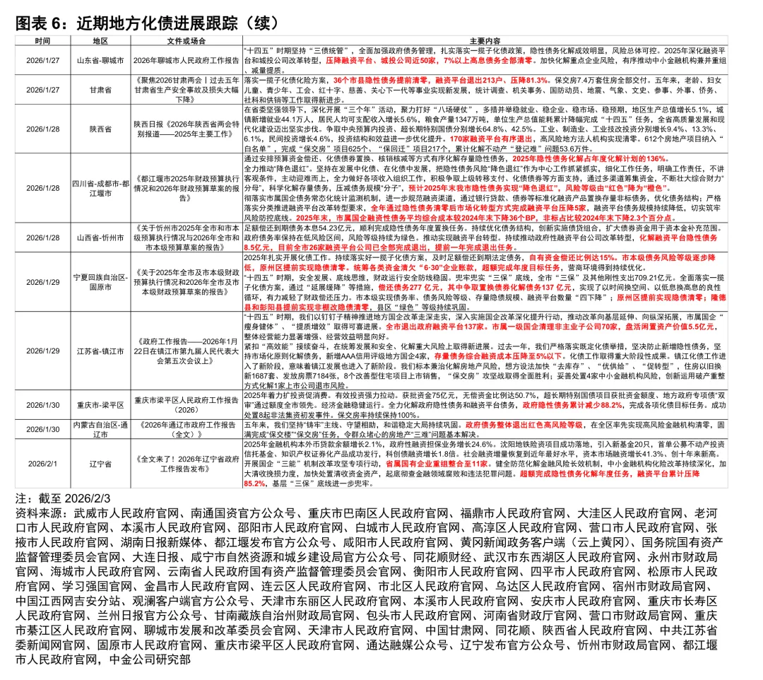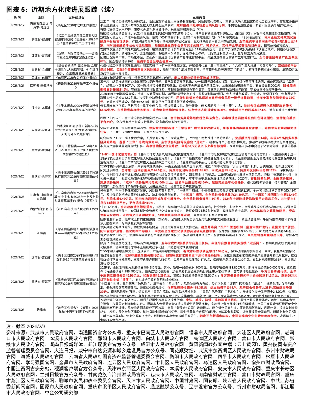 2、 隐债清零:陕西省[7]指出2026年将重点做好9个方面工作,其中包括严防新增隐性债务,加快融资平台市场化转型,力争实现存量隐性债务清零。甘肃省[8] 提到,2026年用足用好化债政策,推动有条件的市县提前实现隐性债务清零。宁夏回族自治区固原市[9]表示,2026年持续强化债务风险动态监测预警,力争实现市本级非棚改存量隐性债务和政府融资平台“双清零”。