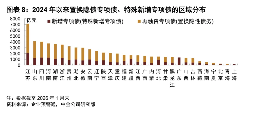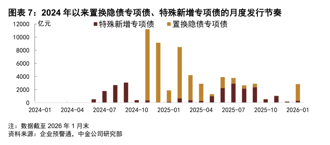 总体看,2026年1月置换隐债专项债、特殊新增专项债合计发行2830亿元,较2025年12月的171亿元明显增长,主要由置换隐债专项债带动。