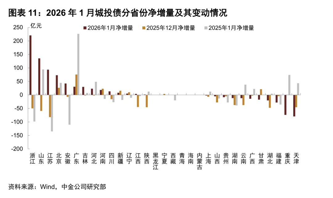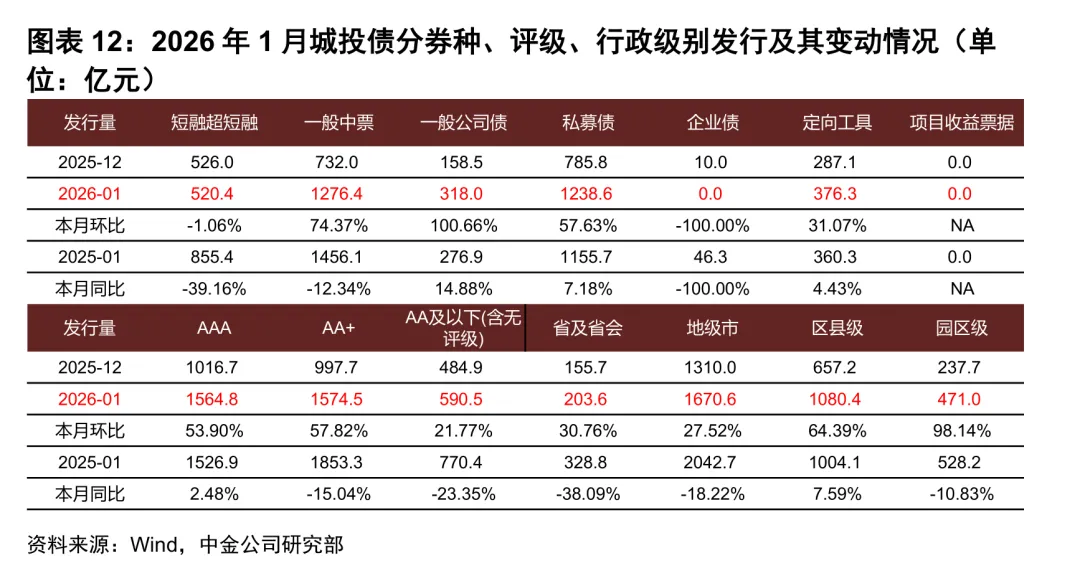 1月单月城投债实现发行量3730亿元,环比增长49%,同比下降10%;净增量427亿元,环比转正、同比净流入扩大。分省份看,江苏城投发行量接近900亿元居首,浙江超600亿元,山东超400亿元,其余省份发行量均不足300亿元;受各地城投到期量影响,半数左右区域净增为零或为负,天津、重庆净流出超50亿元。分券种、外部评级、行政级别看,中票/私募债、AAA/AA+评级、地级市/区县级城投发行量相对较大;中票/私募债、AAA/AA+评级、地级市贡献主要正净增。