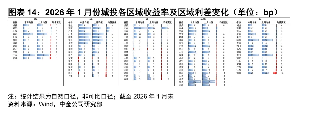 1月城投板块AAA、AA+、AA、AA(2)、AA-隐含评级超额利差均值较12月末分别持平、持平、走扩1bp、持平、持平,整体变动较小。分区域看,AA-评级河南、江西收窄幅度相对居前。