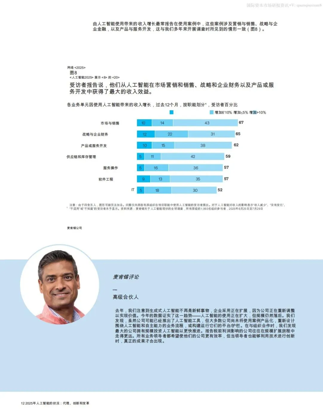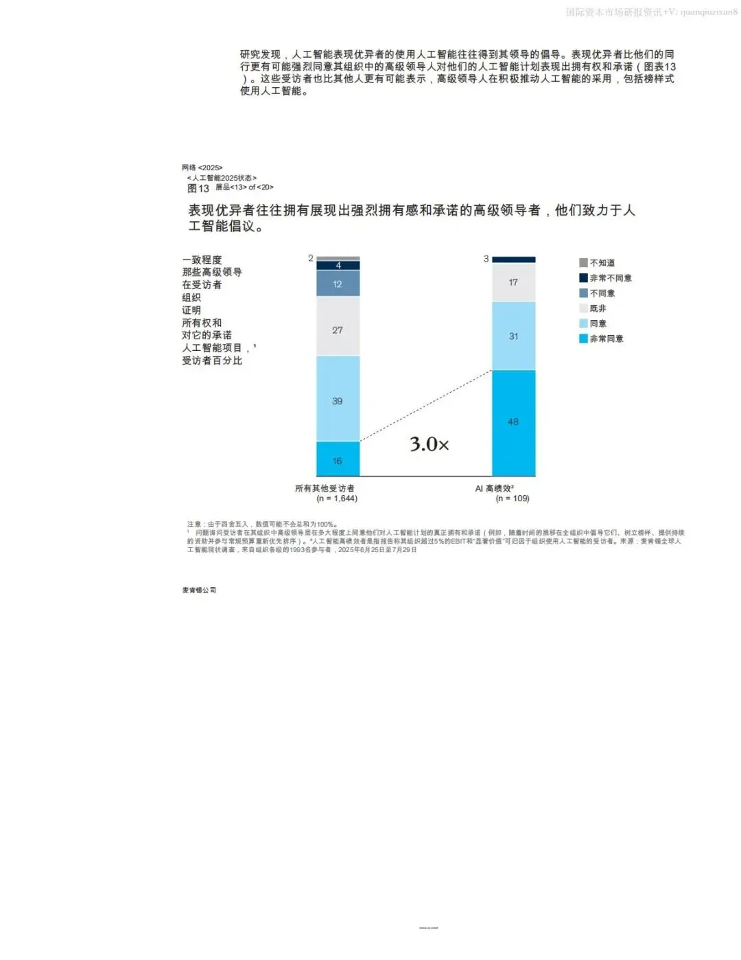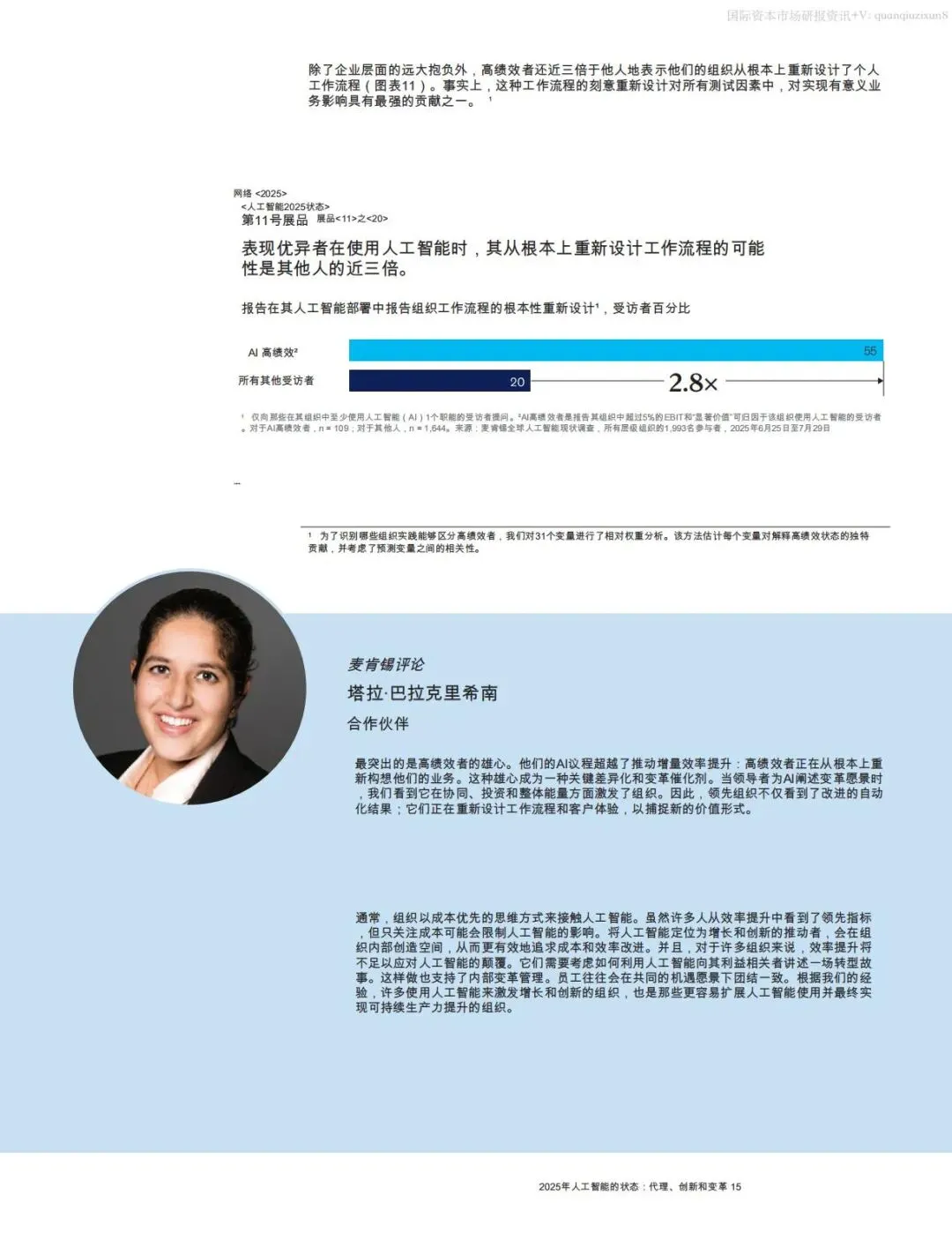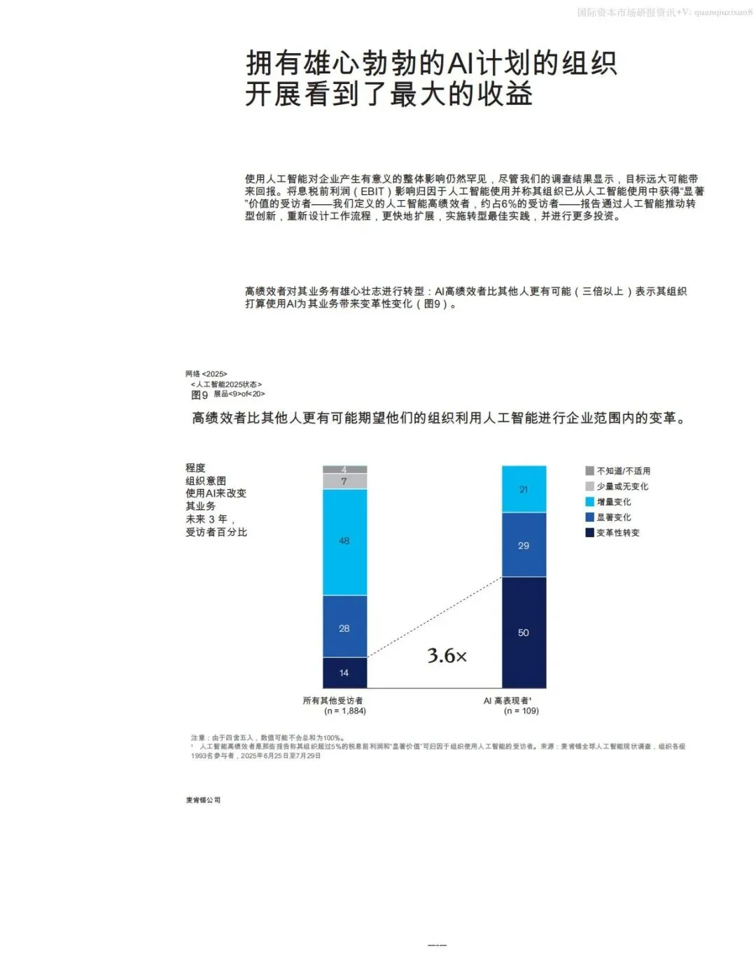 麦肯锡全球高级合伙人表示:“高绩效企业的成功并非偶然。它们不仅具备清晰的AI战略规划,还能够在组织层面进行深度重构,将AI技术深度融入业务流程中。这种战略重构不仅提升了企业的运营效率,还为企业创造了新的增长点。”