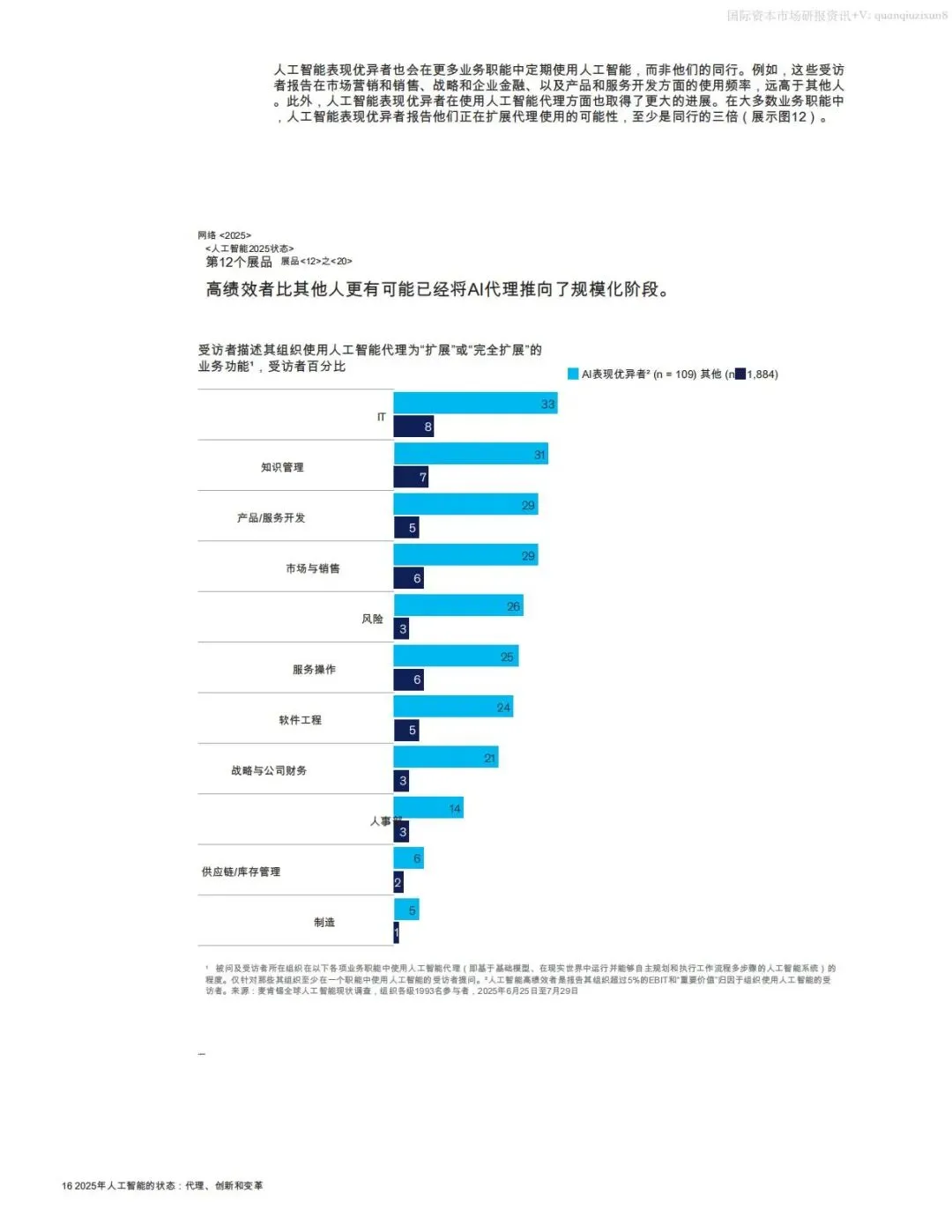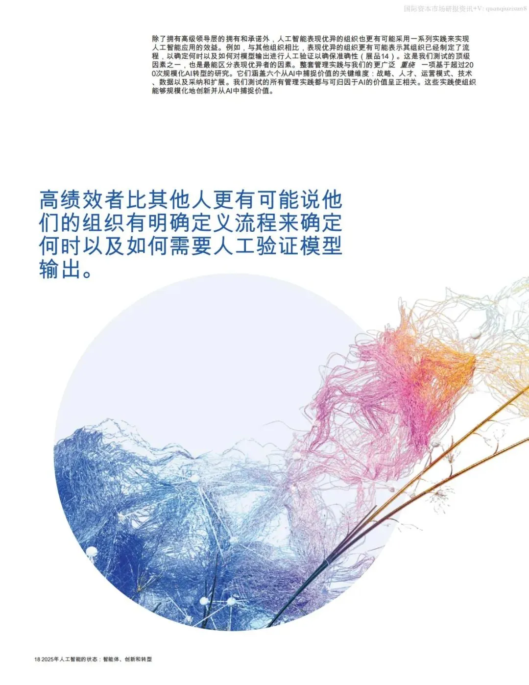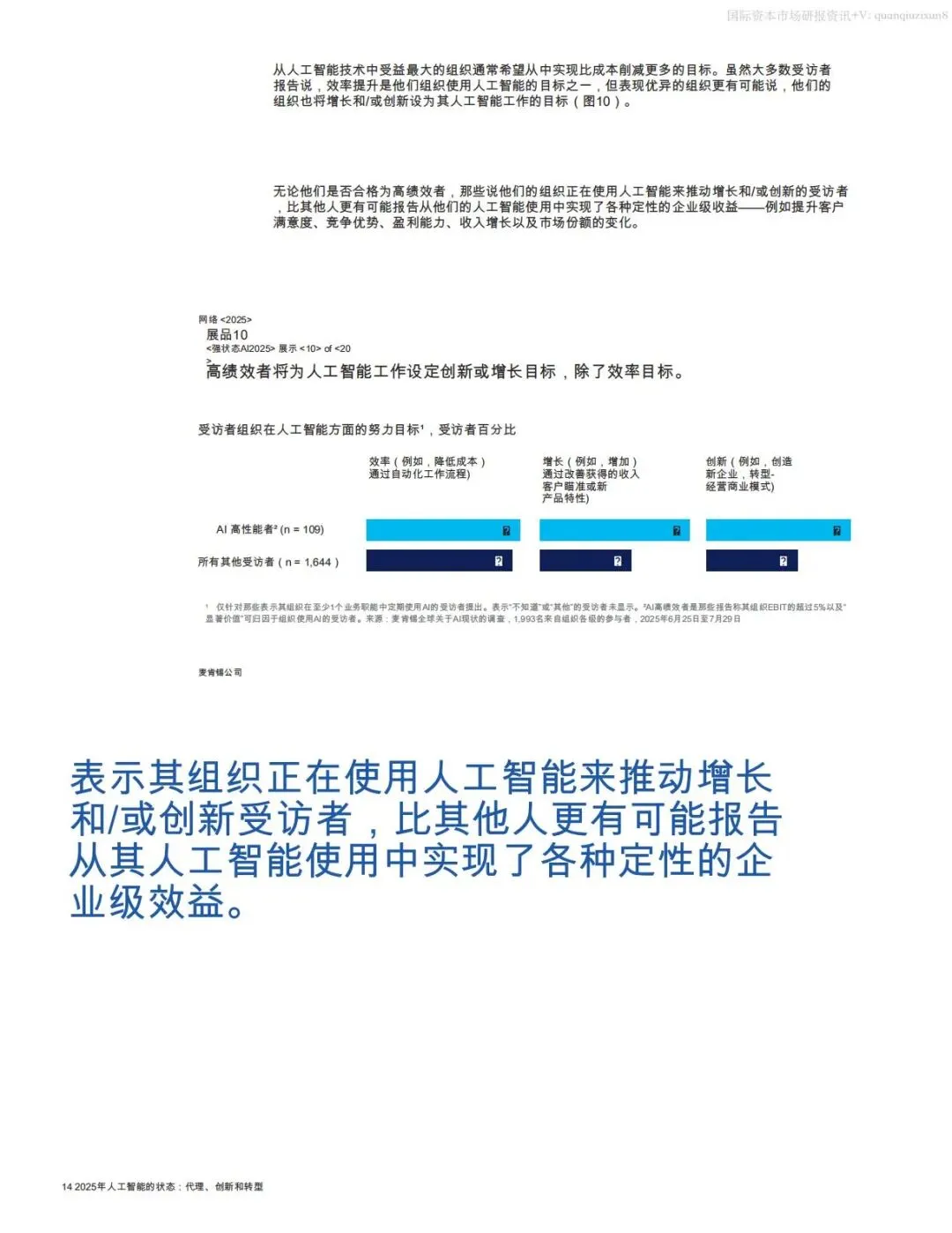报告还揭示了AI红利在不同企业间的分配不均现象。麦肯锡将那些能将至少5%的企业EBIT增长归因于AI,并已在实际业务中实现显著价值回报的组织定义为“AI高绩效企业”。报告指出,高绩效企业在AI战略制定、技术部署、人才招聘、数据治理以及运营流程等方面均表现出色,且更愿意将AI技术视为增长与创新引擎,而非单纯的效率提升工具。