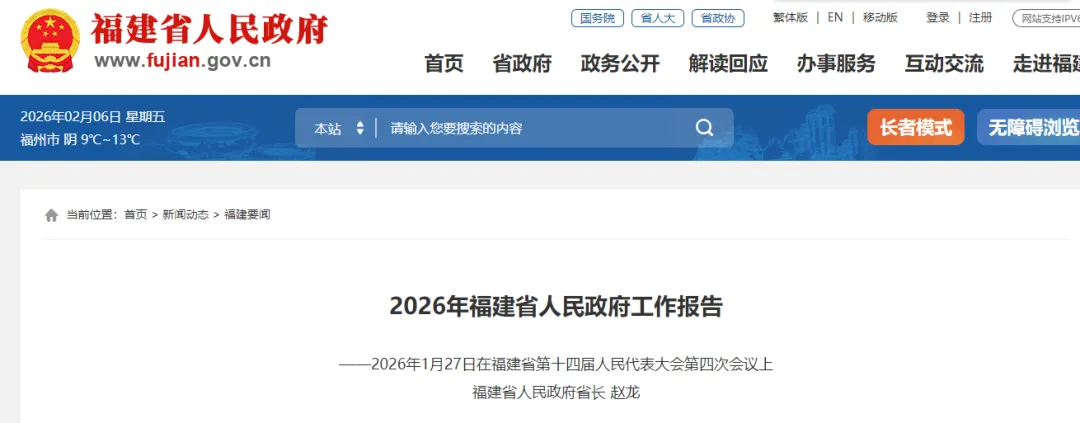 2026年2月6日,福建省人民政府官网发布:2026年福建省人民政府工作报告。
