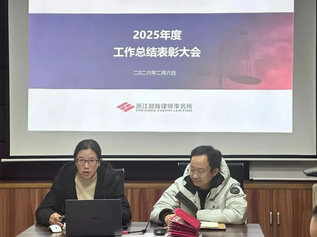 2026年2月6日,浙江越晖律师事务所召开2025年度工作总结表彰大会,旨在全面复盘上一年度工作成果,在肯定各项实绩的同时,深入剖析发展中存在的问题与短板,为新一年的发展筑牢坚实根基。会议分为总结2025年度工作与2025年度先进个人表彰两个议程。