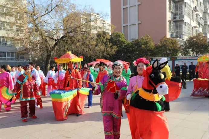 欢腾激昂的赶犟驴、划旱船、扭秧歌等传统民俗表演率先亮相。表演者们身着节日盛装,踏着欢快鼓点,诙谐灵动的演绎引得现场老少观众笑声不断,升腾起浓浓烟火气。