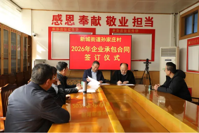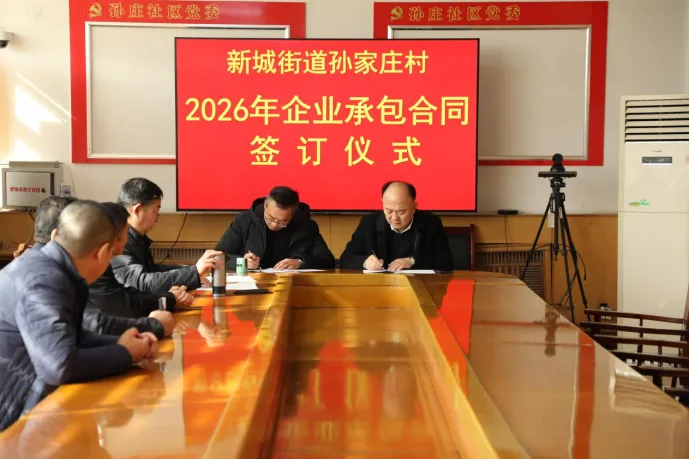 党委书记孙绪国代表村两委与泰安通利达水处理设备有限公司、山东妙巢工贸有限公司换签承包合同。