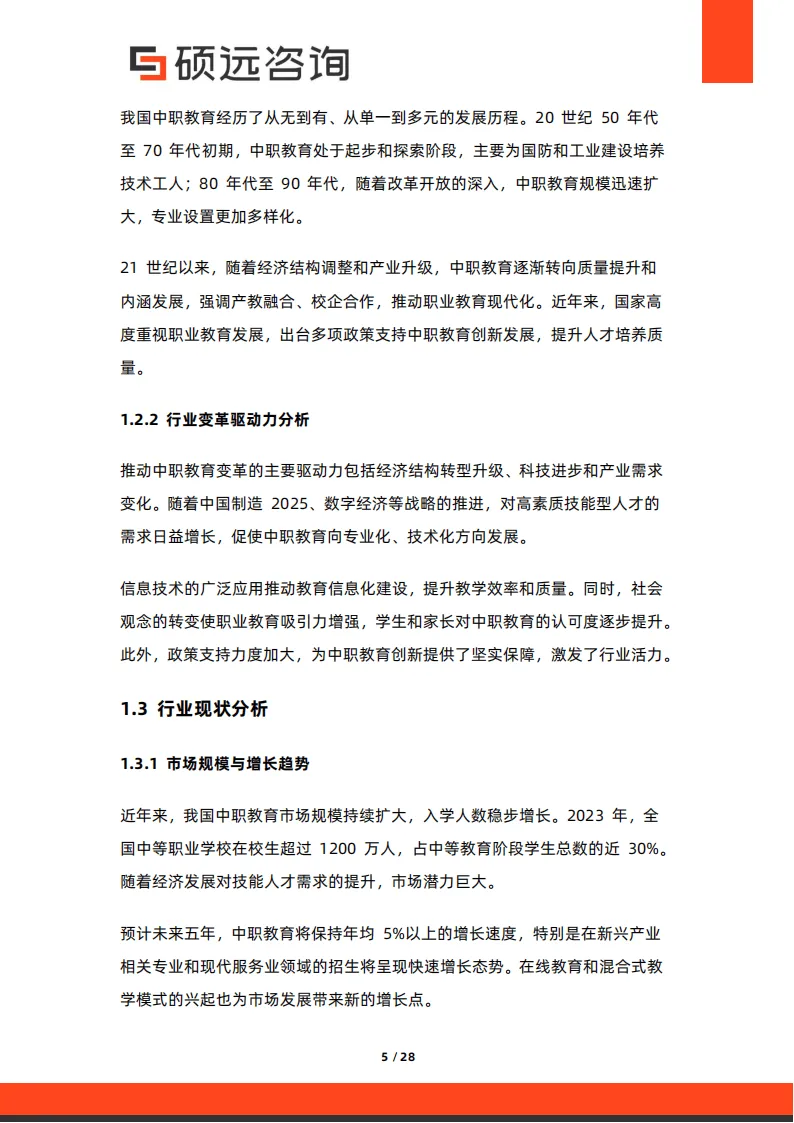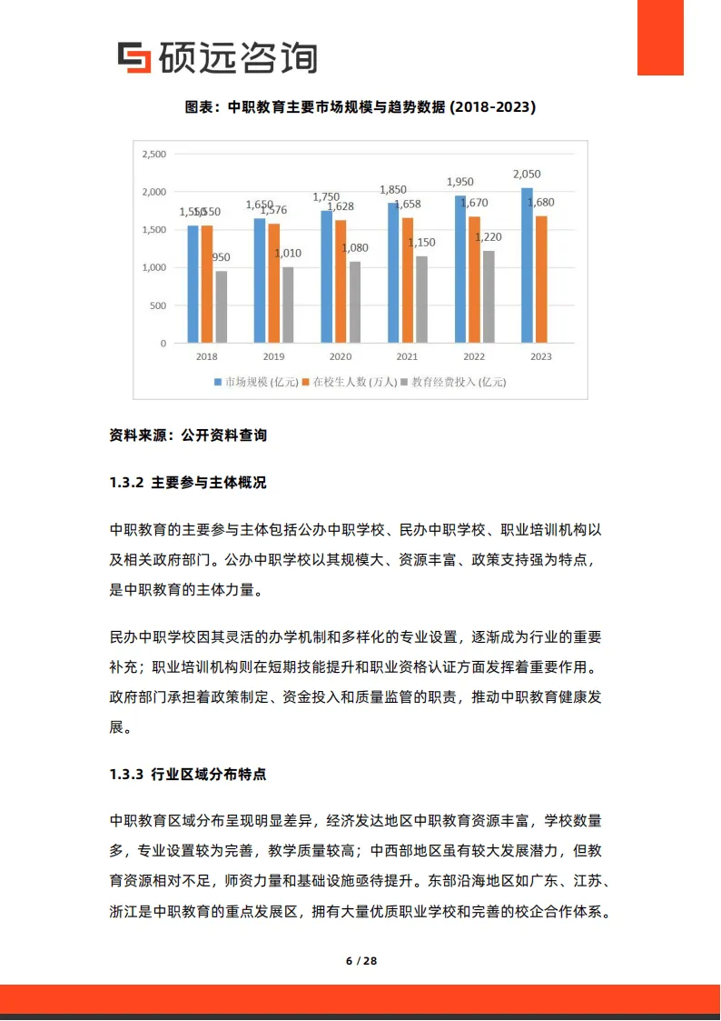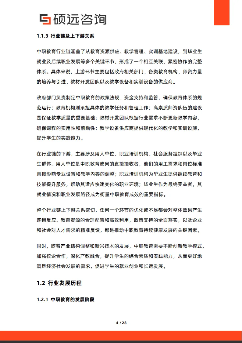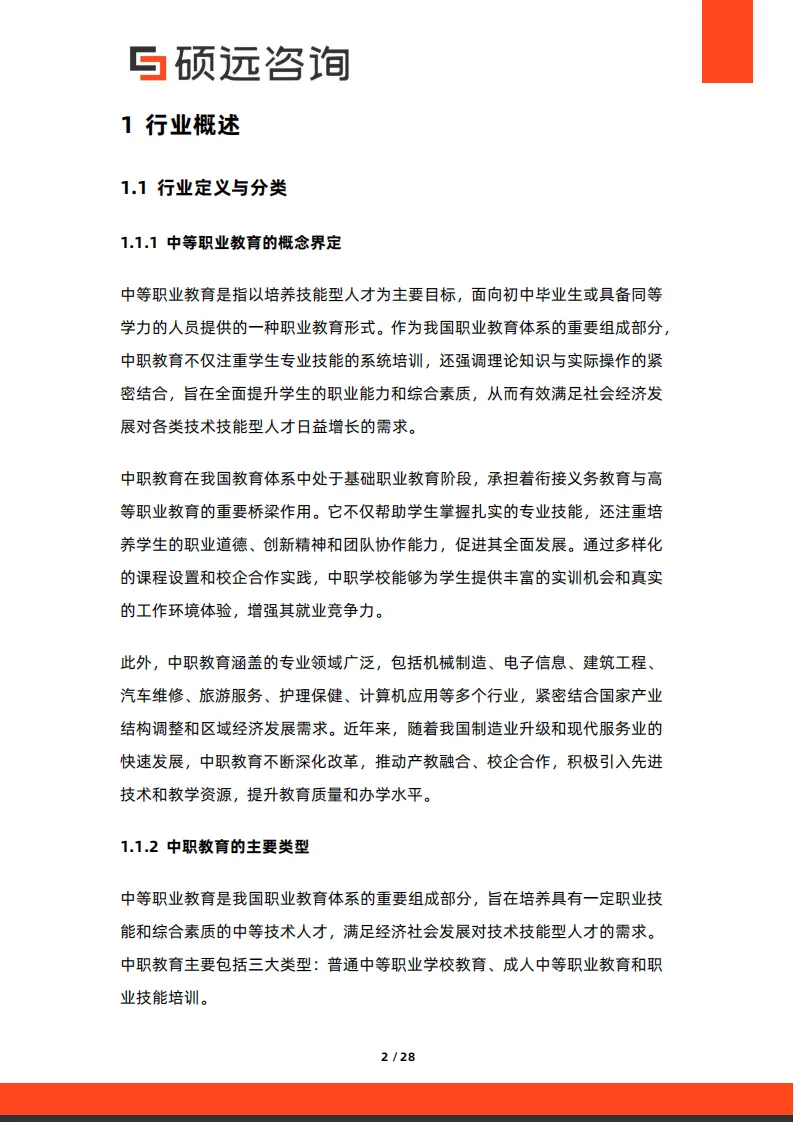 由于公众号资源有限,仅能展示部分少数报告,所有报告原文档均已上传到知识星球”速查报告库”中。加入星球即可无限次下载所有报告,在菜单点击获取报告可查看操作步骤。 客服微信:SCBGK6662025 年中国中等职业教育作为衔接义务教育与高等职业教育的基础职业教育形式,以培养技能型人才为核心,涵盖普通中等职业学校教育、成人中等职业教育、职业技能培训三大类型,专业布局贴合机械制造、电子信息、新能源等产业需求,行业链上下游联动政府、教育机构、用人单位等多方主体,是我国技能人才培养的重要阵地。未完……更多详细请下载完整报告