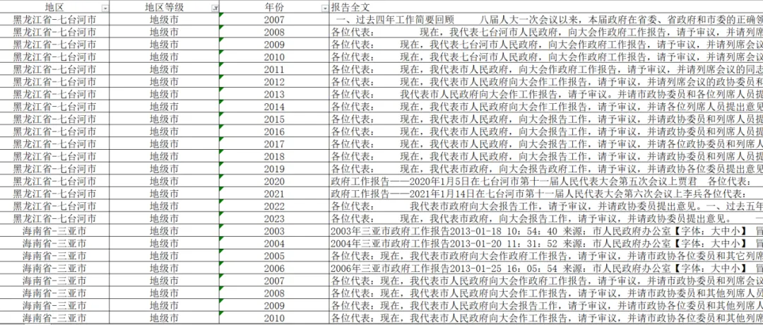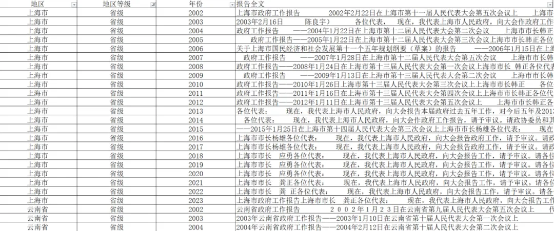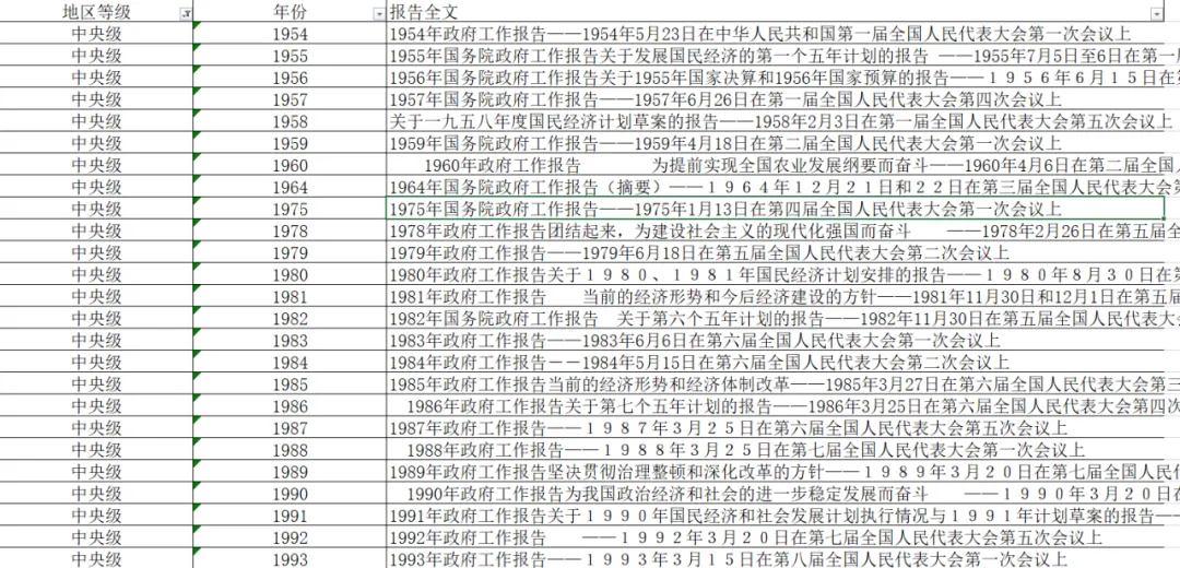 目前,国务院政府工作报告、全国31个省、市年政府工作报告已披露至2026年,明树数据通过地方政府官网收集政府工作报告原始文件,在保证官网原始文本、文本长度、词频总数完整基础上,通过整理,将数据梳理为标准化项目清单,包含地区、地区等级、年份、报告全文4个指标。本次明树数据共梳理了自1954年至今发布的中央、省级、市级共6000余份政府工作报告:
