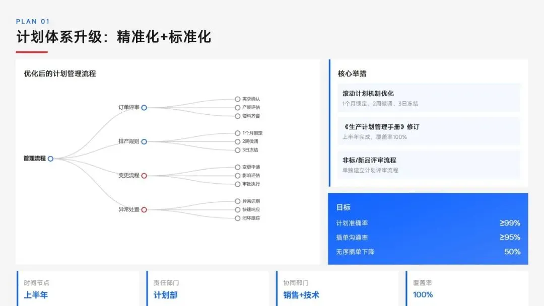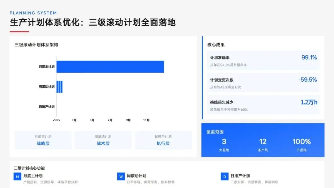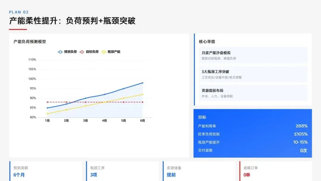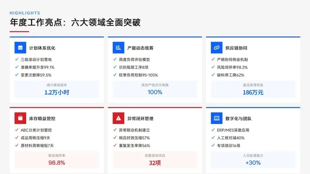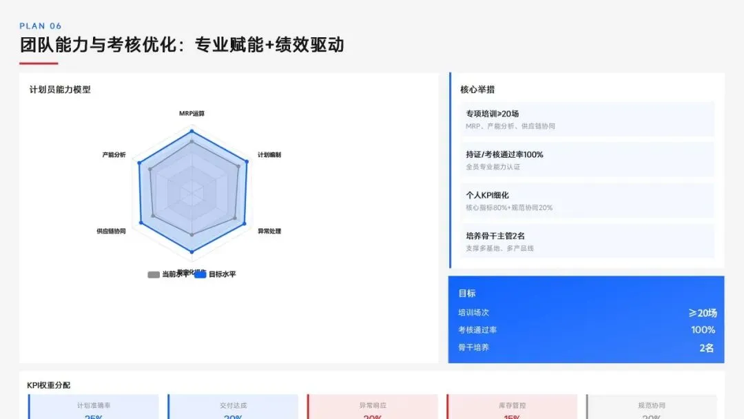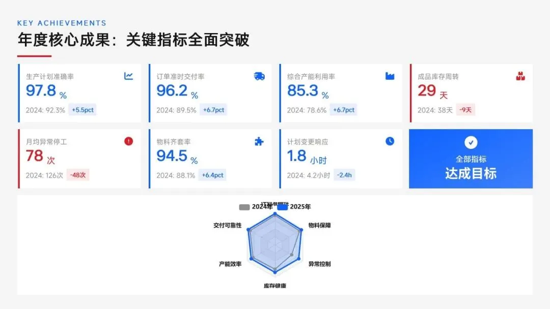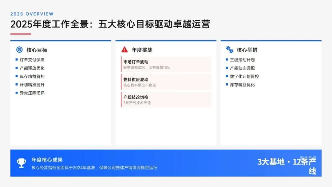 生产计划部 2025 年度工作以订单交付、产能优化等五大核心目标为导向,实现生产计划准确率、订单准时交付率等七项核心 KPI 全面改善,在计划体系、产能统筹、供应链协同等六大领域取得量化突破,核心指标迈入行业中上水平。同时复盘出紧急插单管控、非标新品计划精准度不足等五大核心问题并完成根因剖析。2026 年部门锚定计划准确率≥99%、交付率≥98% 等七大核心 KPI 目标,确立精准计划、高效产能等五大战略支柱,规划计划体系升级、产能柔性提升等七大重点工作,配套制度、系统、资源、考核四大保障体系,以数字化、标准化、协同化打造高效柔性的生产计划管控体系,为公司整体经营目标达成筑牢生产计划支撑。十五五规划编制实战指南:7大工具+案例,破解企业战略迷局