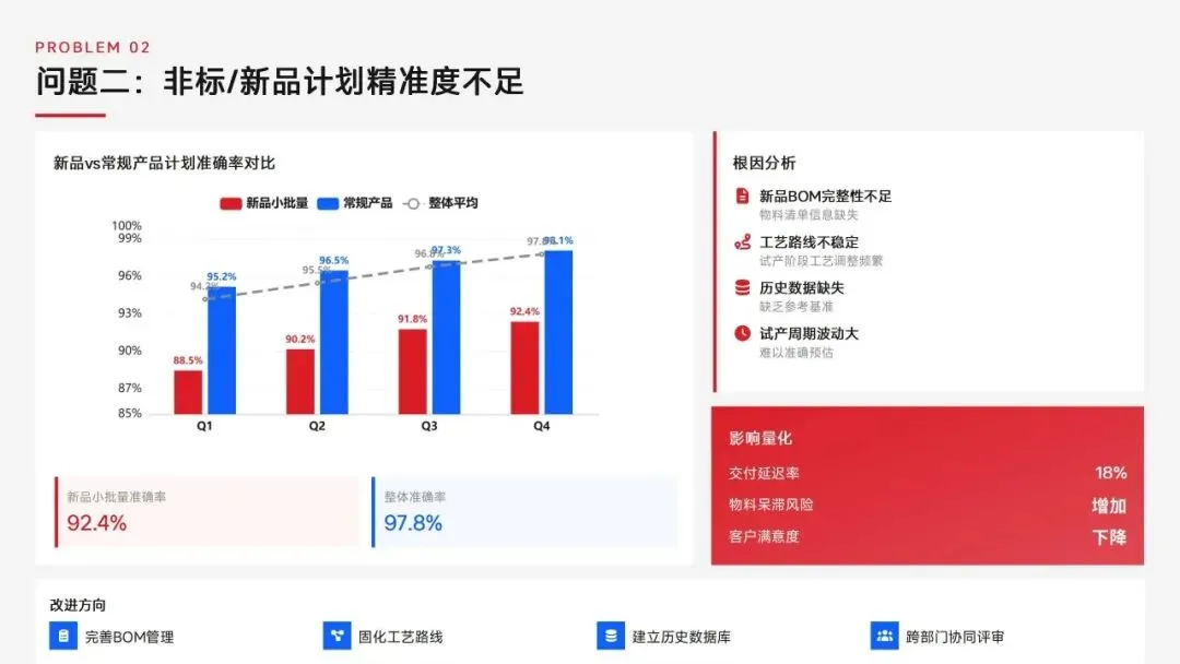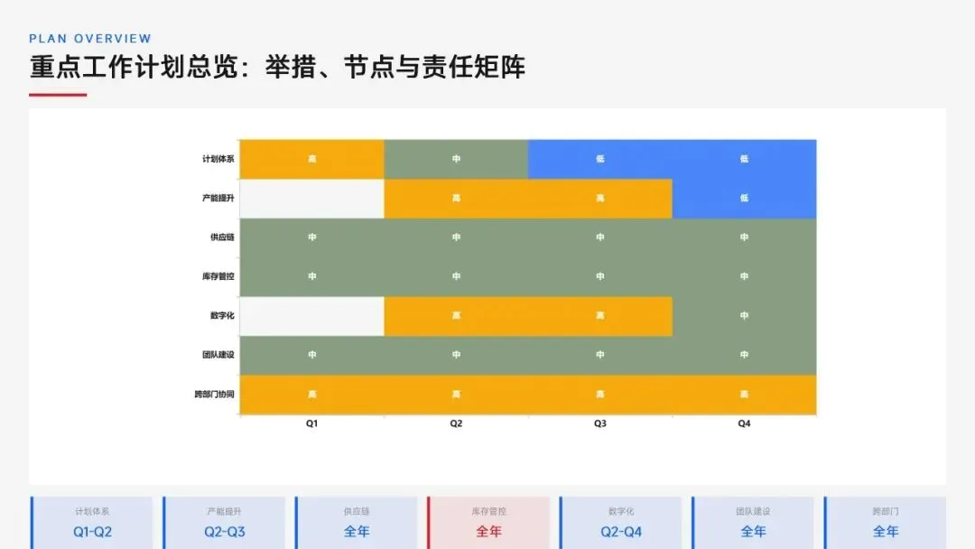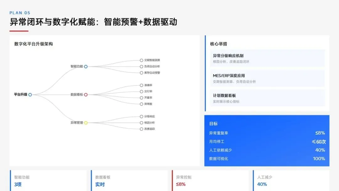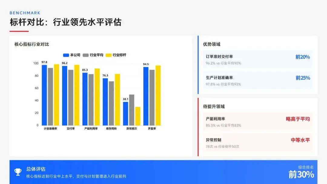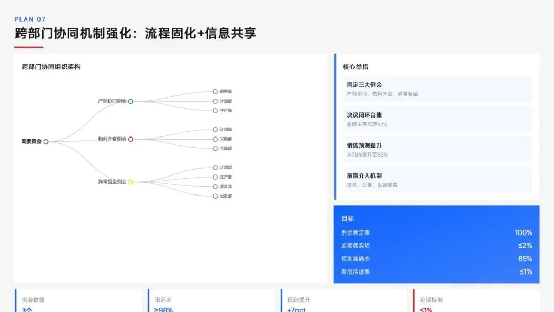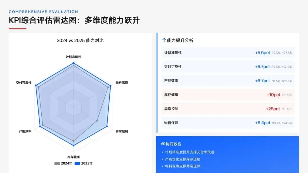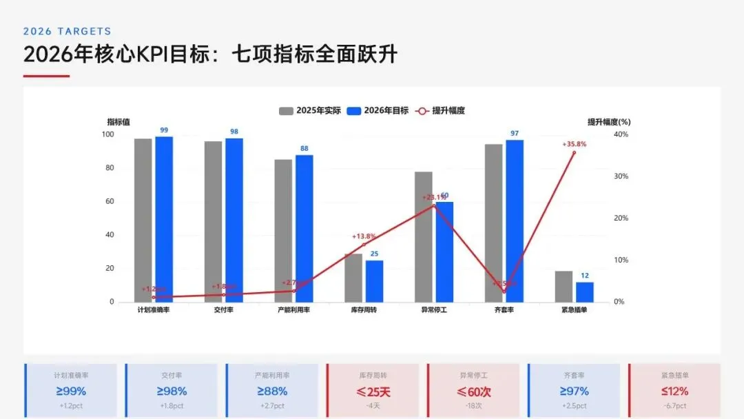 生产计划部 2025 年度工作以订单交付、产能优化等五大核心目标为导向,实现生产计划准确率、订单准时交付率等七项核心 KPI 全面改善,在计划体系、产能统筹、供应链协同等六大领域取得量化突破,核心指标迈入行业中上水平。同时复盘出紧急插单管控、非标新品计划精准度不足等五大核心问题并完成根因剖析。2026 年部门锚定计划准确率≥99%、交付率≥98% 等七大核心 KPI 目标,确立精准计划、高效产能等五大战略支柱,规划计划体系升级、产能柔性提升等七大重点工作,配套制度、系统、资源、考核四大保障体系,以数字化、标准化、协同化打造高效柔性的生产计划管控体系,为公司整体经营目标达成筑牢生产计划支撑。十五五规划编制实战指南:7大工具+案例,破解企业战略迷局