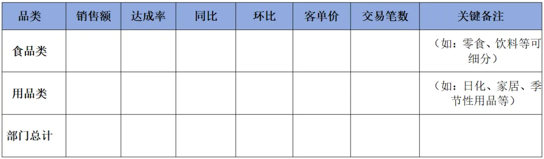 例如:“本周‘冬日火锅节’主题促销完成,饮品品类销售额环比提升25%,但关联商品(如冻品丸子)销售目标未达预期。”