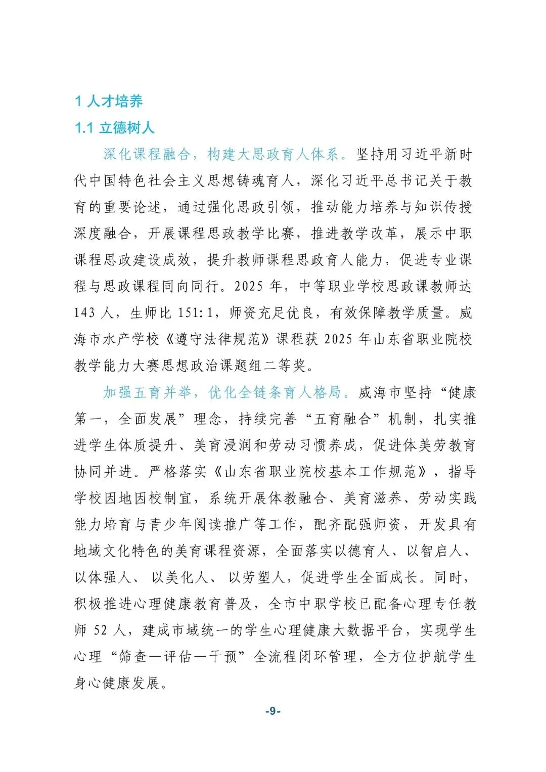 加强五育并举,优化全链条育人格局。威海市坚持"健康第一,全面发展"理念,持续完善"五育融合"机制,扎实推进学生体质提升、美育浸润和劳动习惯养成,促进体美劳教育协同并进。
