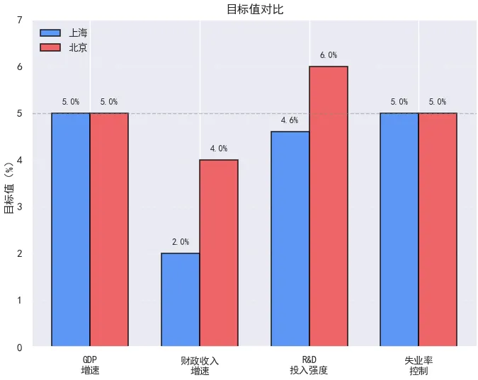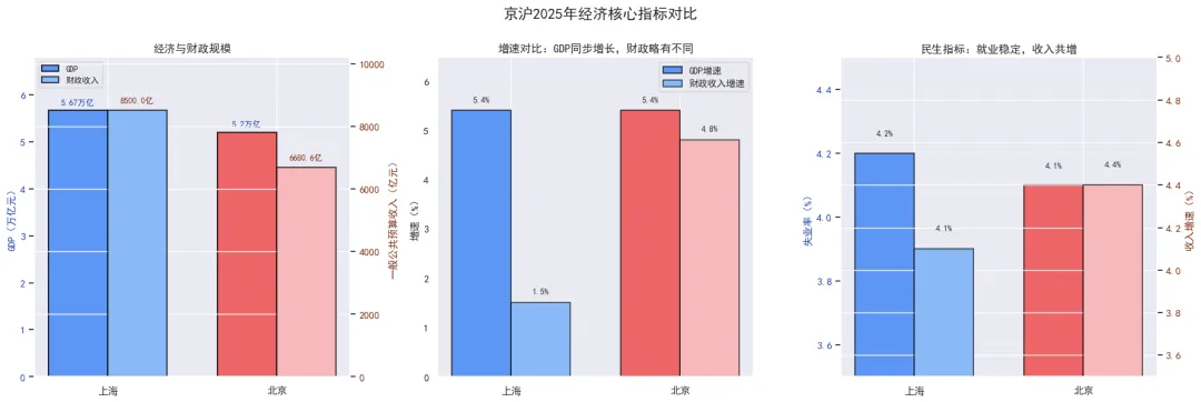 整体观之,京沪在2026年的政策表达呈现出“同频共振、各展所长”的格局:2025年经济增速同为5.4%,2026年增长目标均设定在5%左右;民生议题高度重合,“一老一小”、住房保障成为共同重点;人工智能、6G、商业航天等未来产业布局也多有交集。但特色同样清晰——上海更强调“智造”与产业体系升级,北京侧重“科创”与原始创新策源;上海突出“制度型开放”,北京强化“功能型开放”;财政体量与结构韧性方面,各自呈现不同优势。趋同之中见分工,重合之下有侧重。