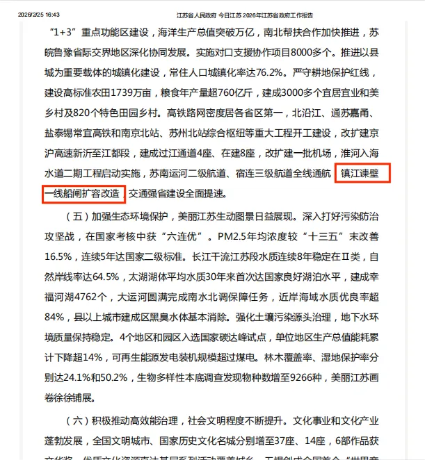作为苏南运河“三改二”工程的先导项目和“水运江苏”建设的代表性工程,“谏壁一线船闸扩容改造工程开工建设”于2024年首次写入省政府工作报告。如今,谏壁一线船闸已投入试运行,年通过能力将实现跨越式提升,为苏南运河发展注入全新动能。近日,“谏壁一线船闸扩容改造”再度写入2026年省政府工作报告。
