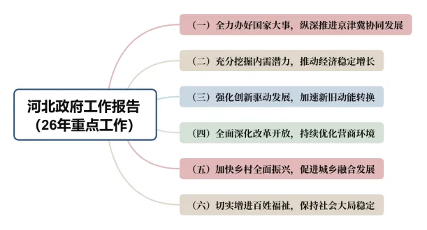 2026年河北省政府工作报告将扩内需、挖潜力、稳增长放在重点工作位置,明确提出要推动消费扩容升级、优化消费环境、打造“一刻钟便民生活圈”,同时结合“这么近、那么美,周末到河北”品牌,大力发展文旅消费、赛事经济等新业态,释放消费潜力。